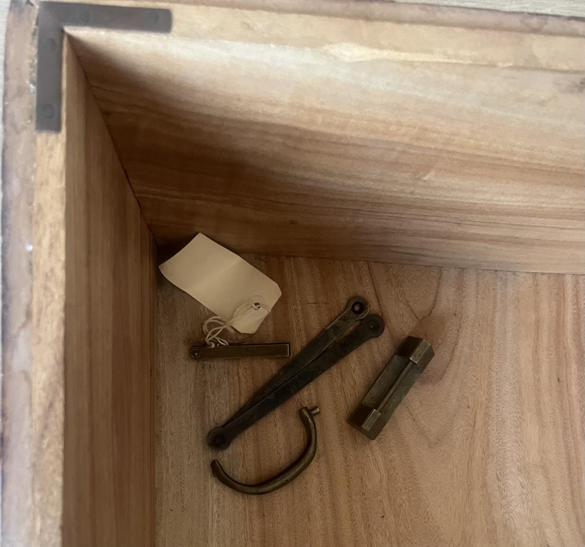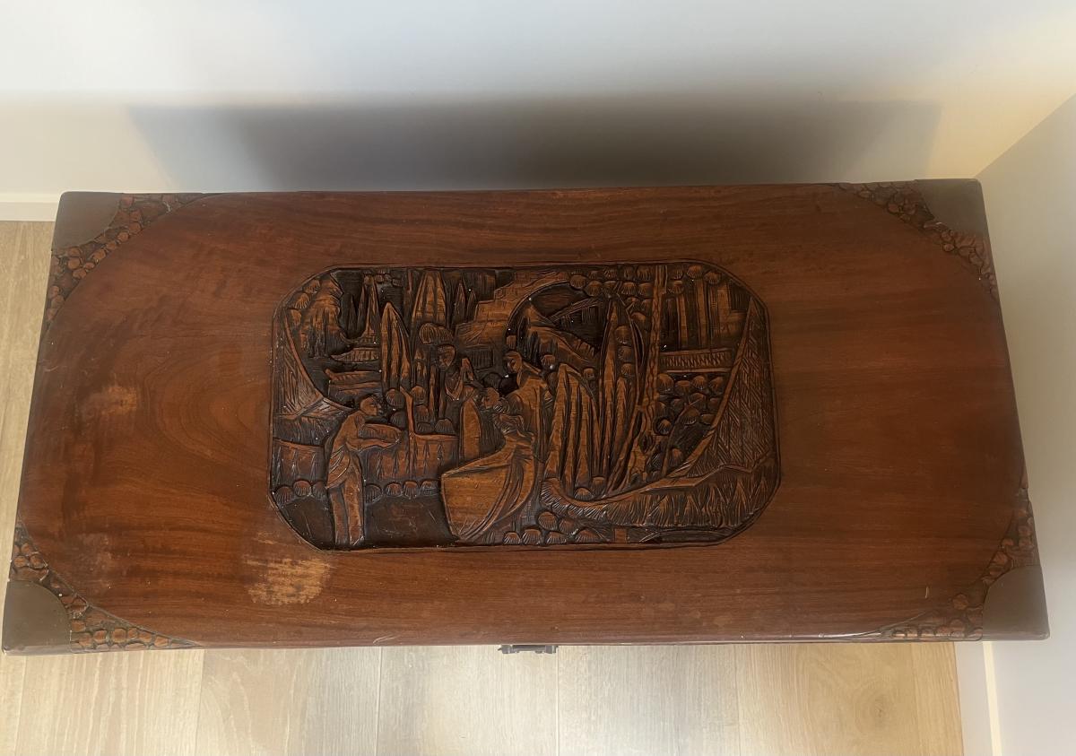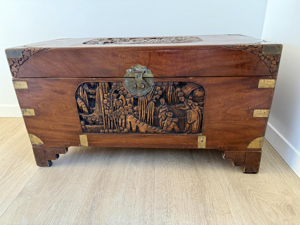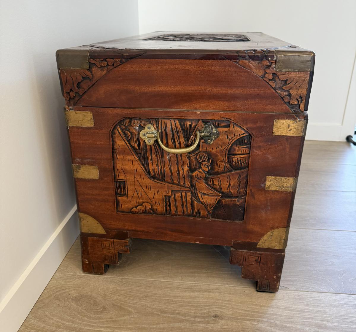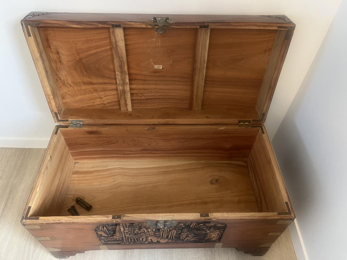 This is a genuine Camphor Chest. Notice on the top there are a few water marks. One of the brass handles needs repair as shown in photo. The handle parts are shown inside box.