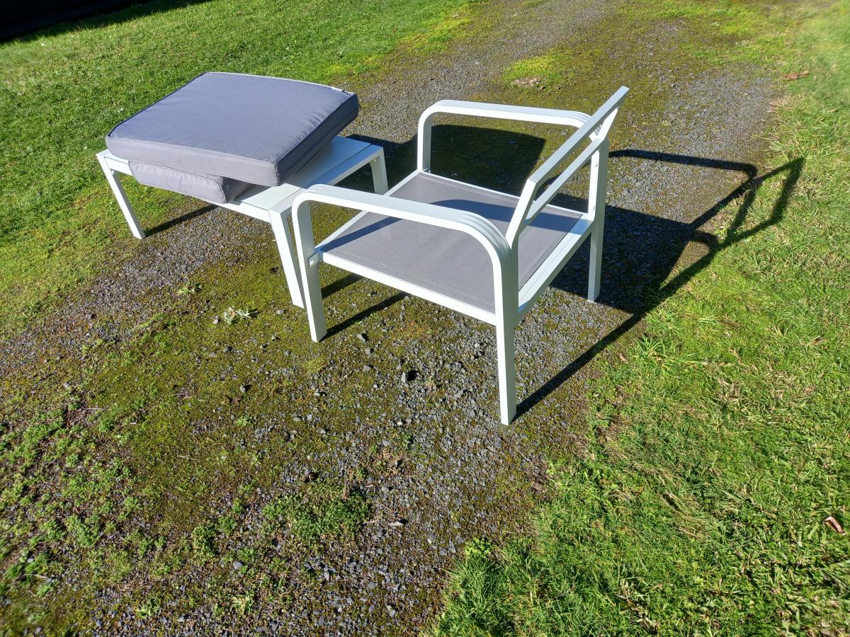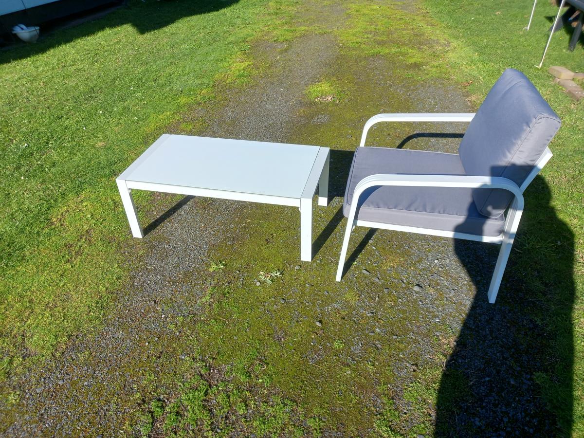 They are exactly the same as the 4 piece set for sale now (Wednesday 16 July 2025) in South Bunnings, Kahikatea Drive, Hamilton at $599.00. They were purchased and immediately put into my warm dry cabin outside and the two seater used long enough to know it worked for me and would not be sold as a set. There is one chair complete with grey cushions and one oblong glass table top for sale. The glass is silky white smooth on one side and on the other side a traction fine mesh like surface which gives the appearance of greyish white. The metal should be maintenance free and I would recommend as with all cushions, keeping the cushions in dry places when not in use or in winter weather.