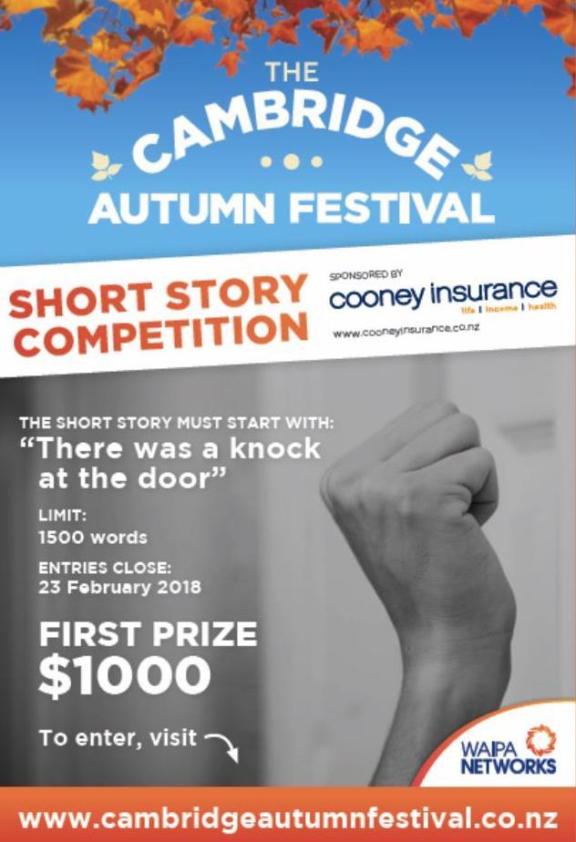 Entries close 23 February 2018 so writers have all summer to pen their story. The winners will be announced at the awards night during the Autumn Festival. More details about the competition are on the entry form or on Cambridge Autumn Festival website (cambridgeautumnfestival.co.nz).