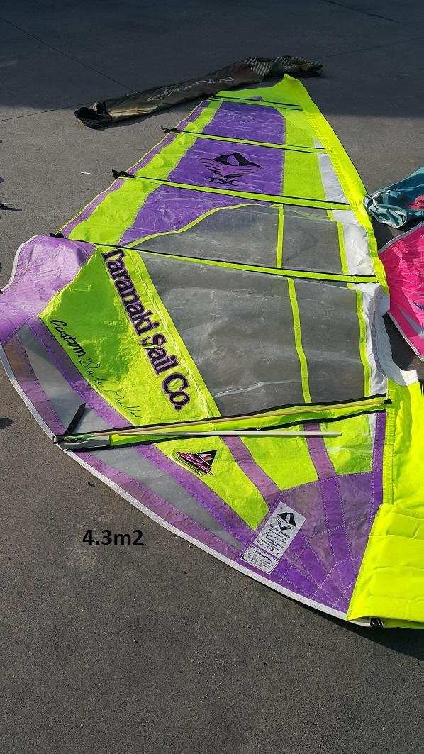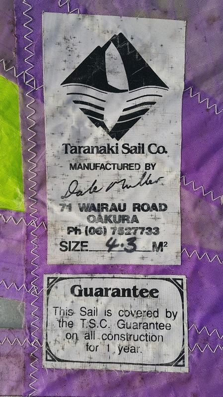 4.3m2 sail - Taranaki Sail Co. $ 25,- Sail bag $ 3,-