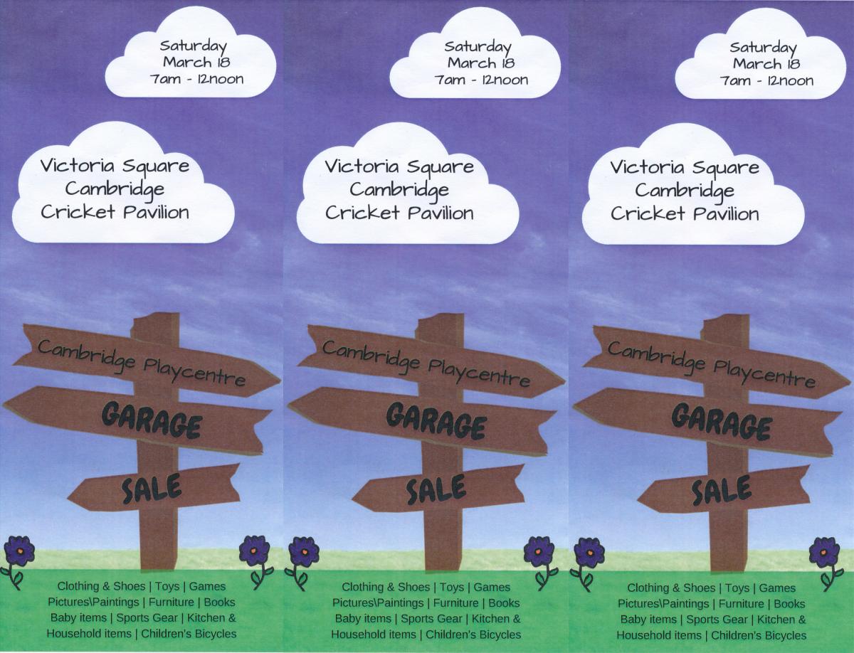 Cambridge Playcentre Garage Sale at the Cricket Pavilion Victoria Square Cambridge this Saturday 16 March 2017 7AM - NOON