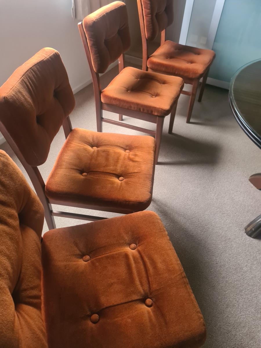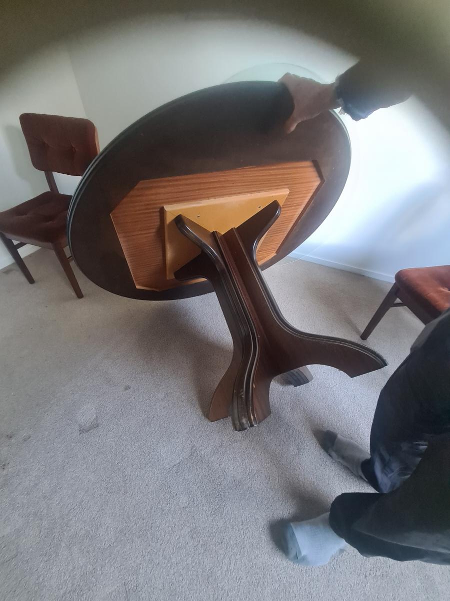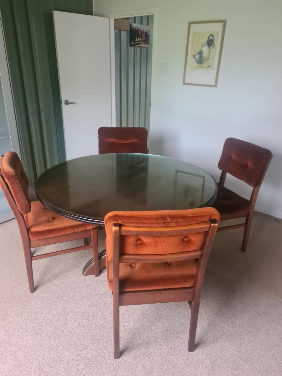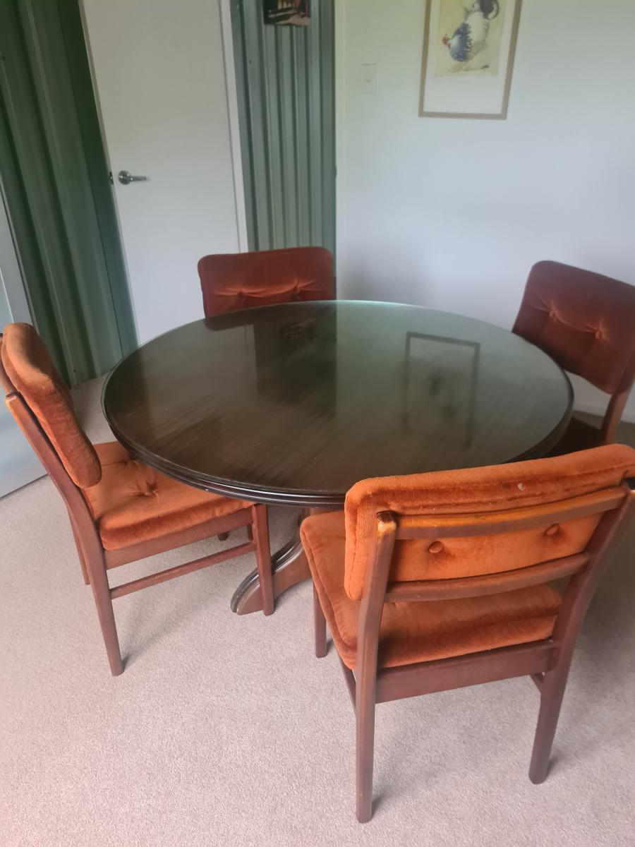 Small dining table with glass top for protection. 4 very comfortable chairs in good order. 1.18 m diameter. Contact janrow@xtra.co.nz, cambridge to view.