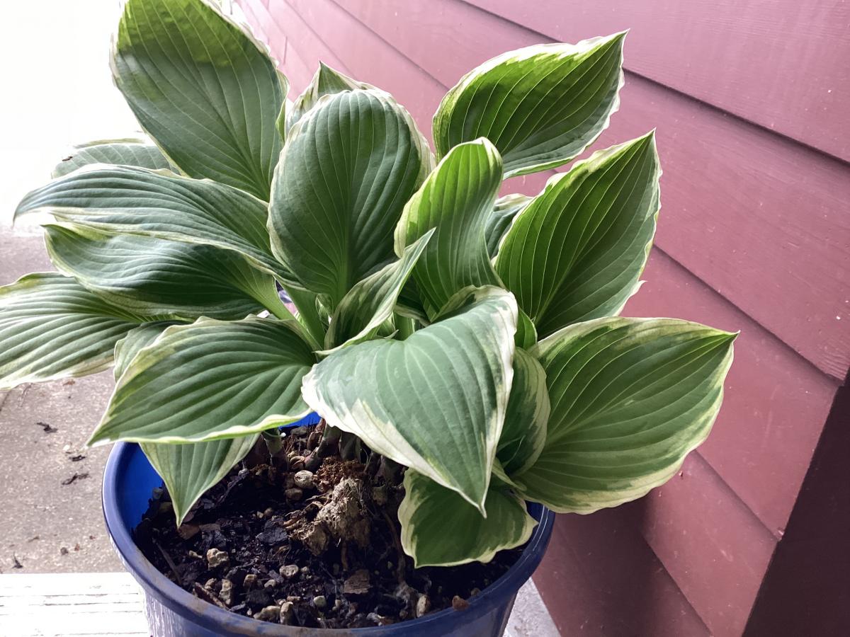 Potted hosta which could slip out of its pot into the garden quite easily.