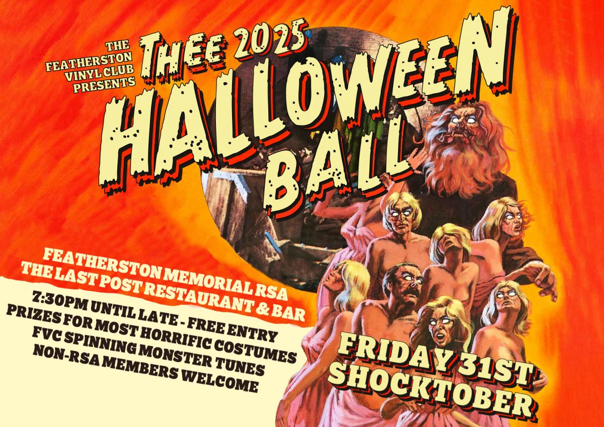 Join us in your evening scare-ware at Featherston Memorial RSA // The Last Post for some bone-chilling choons and ghoulish grooves. Since 2022 we’ve been haunting … View moreNever fear boils & ghouls - the Featherston Vinyl Club's spooky DJs are back to raise heck this Halloween!
