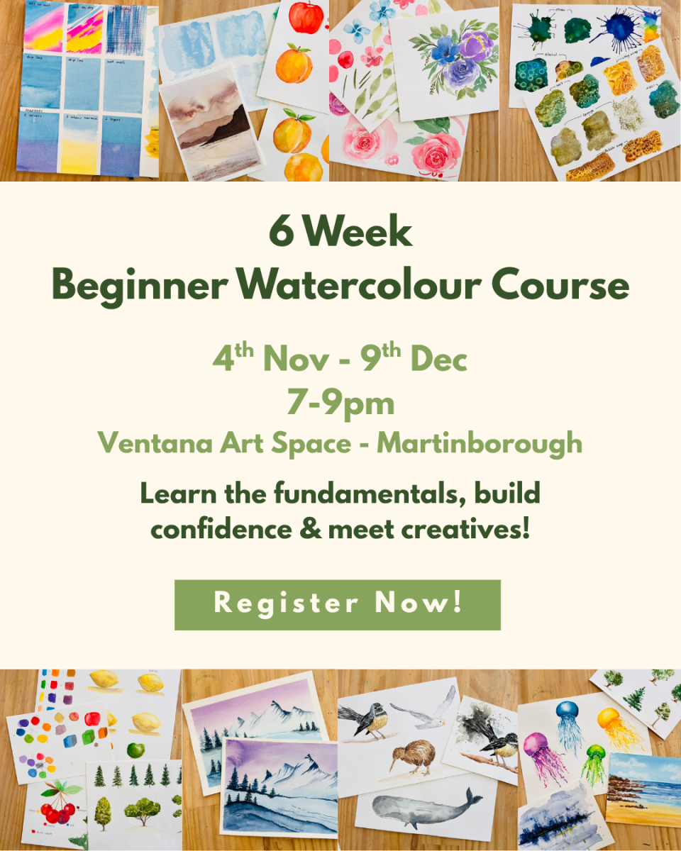 Hello! I'm running a 6 week beginner watercolour course at Ventana in Martinborough. If you've ever thought about learning to paint- this is for you! No experience needed, meet some lovely like-minded people.