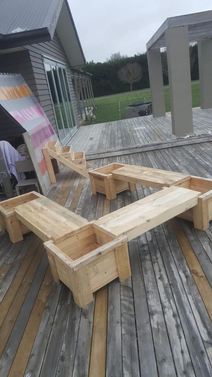 Planters measure at 450 square x 280 in depth and three double seats at 850 long