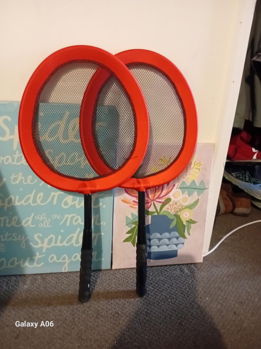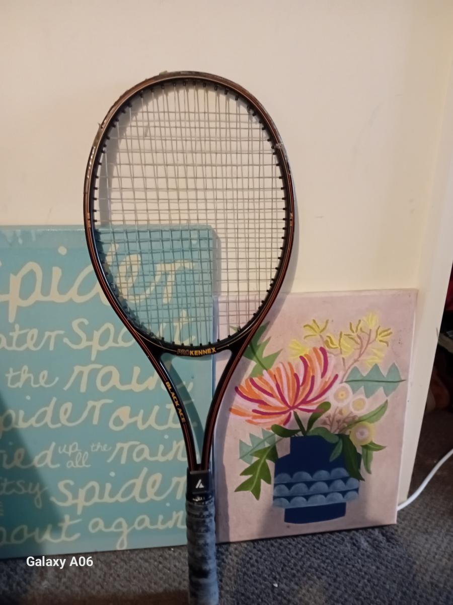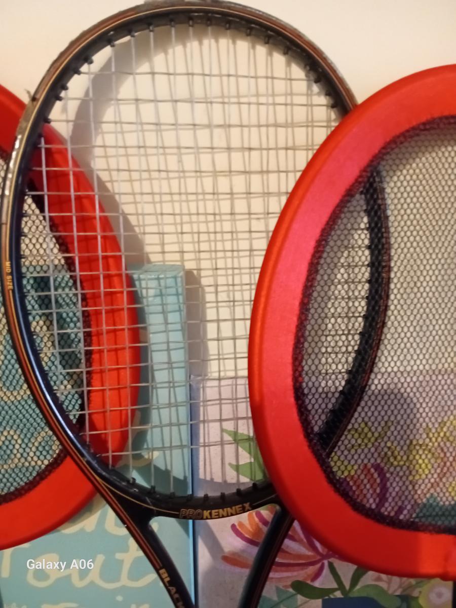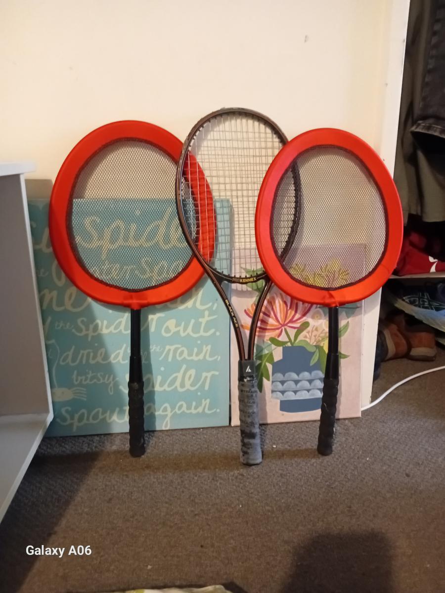 Hi tennis racket + 2 other rackets good for any one Has got hard strings still . Tennis racket is Black ace PROKENNEX mid size