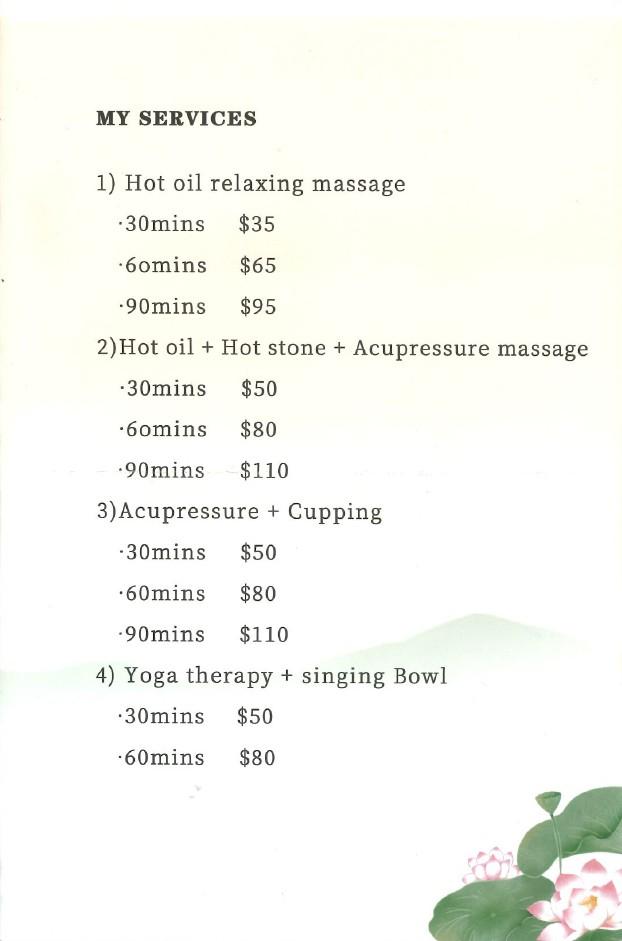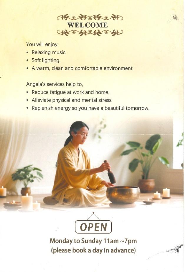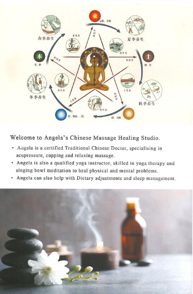 Visit Angela's Chinese Massage Healing Studio for therapeutic massage (hot oil/hot stone/acupressure), cupping, yoga or singing bowl.