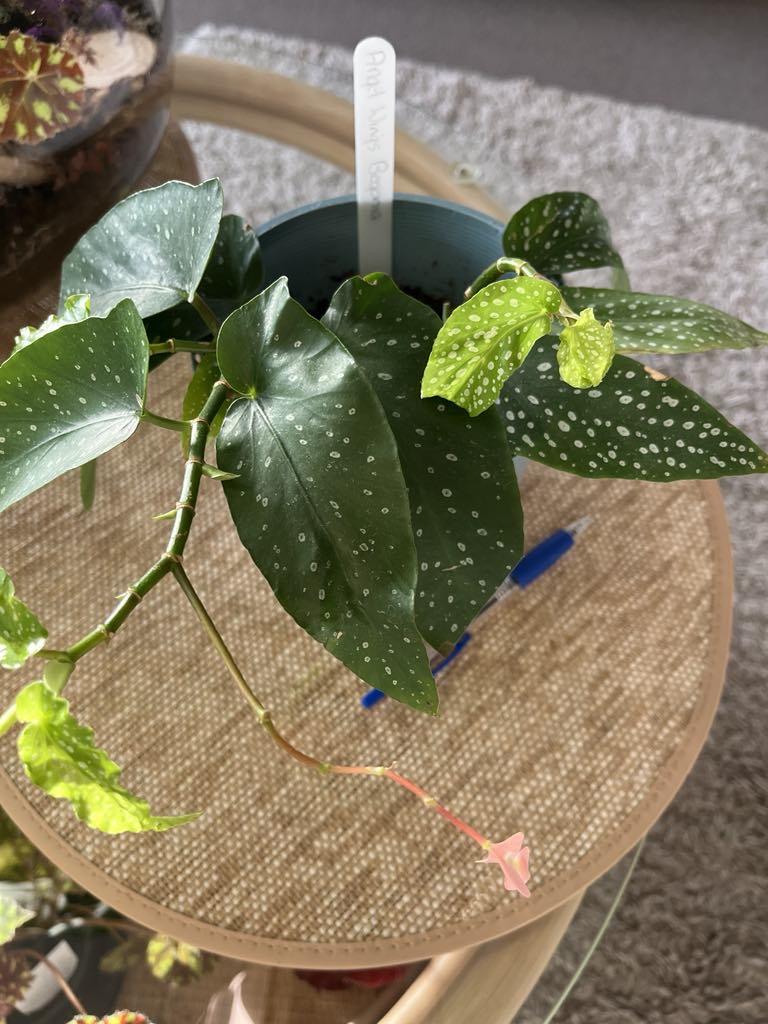 Angel Wings begonia. Sunny spot, don’t overwater. Trim to keep bushy