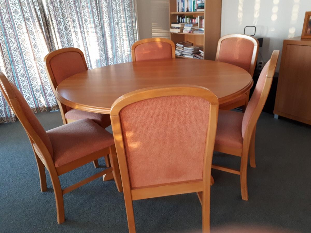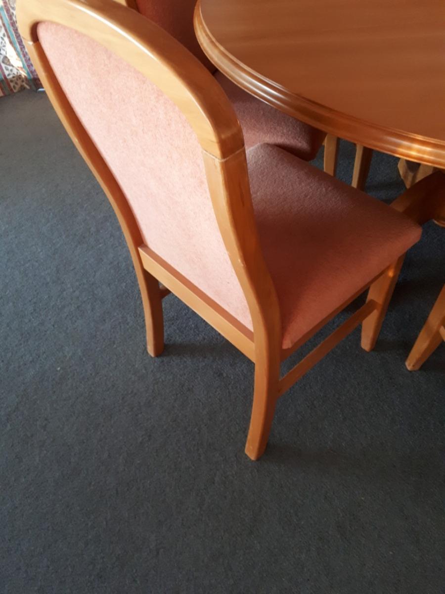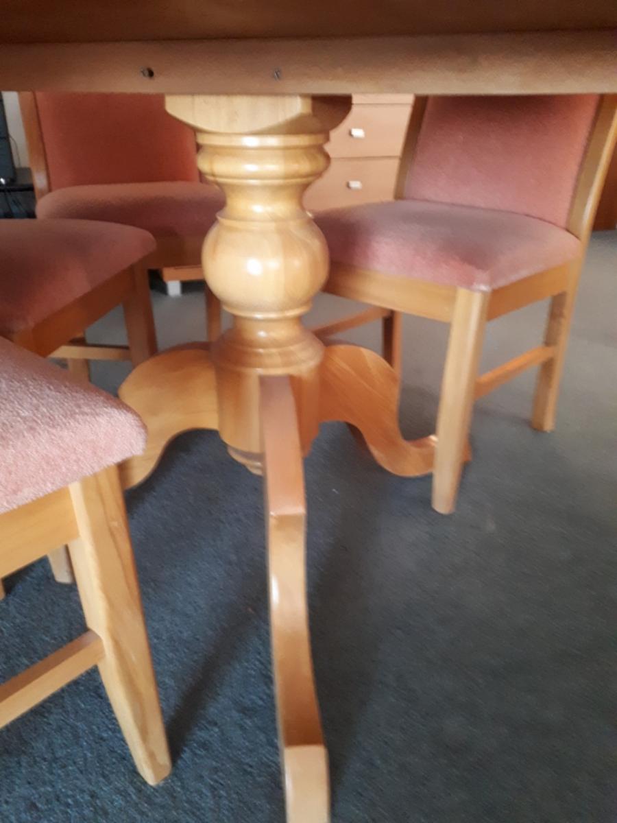 Solid rimu round pedestal table and 8 chairs in excellent condition. $600