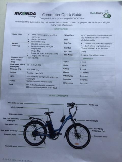 E-bike, the Commuter, NZ made by Rikonda and is about 14 months old although only used about three months. I have moved to Lower cashmere and cannot manage to lift the bike on to a carrier. The bike weighs 28kg and is designed to cycle to work and follow the trails about ChCh, not really intended … View moreE-bike, the Commuter, NZ made by Rikonda and is about 14 months old although only used about three months. I have moved to Lower cashmere and cannot manage to lift the bike on to a carrier. The bike weighs 28kg and is designed to cycle to work and follow the trails about ChCh, not really intended for heavy duty riding such as hill work. It is in excellent order and includes a helmet, a basket , gloves and an extra ‘D Lock’. Also has an accelerator which is handy for quick entry and exit from intersections. You are welcome to view.