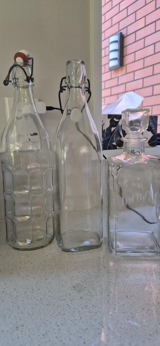 2 tall glass water bottles, 1 shorter, a good size for port.