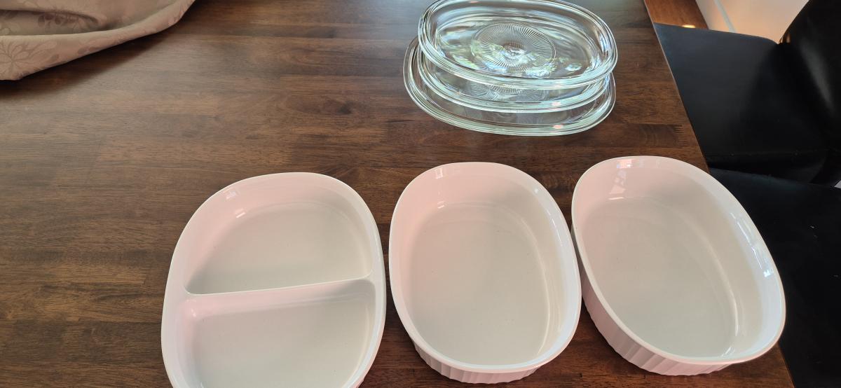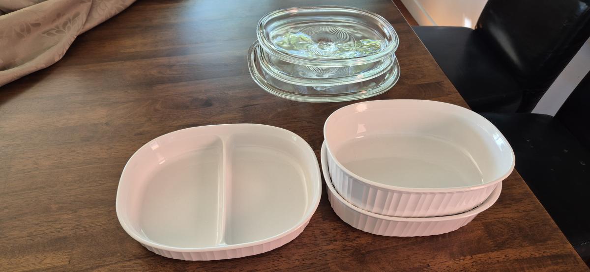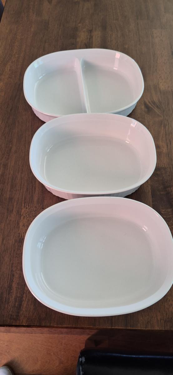 3 Corning ware dishes. Great condition. Dish with divide is 4.5cm high x 28cm wide.