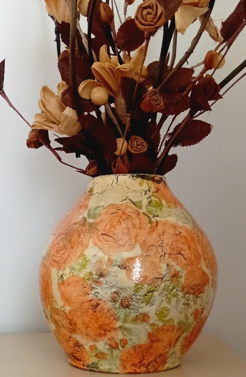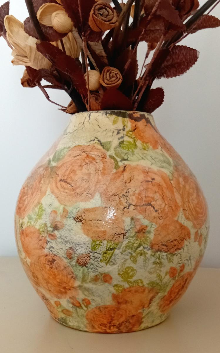 The vase is decoupaged with Neutral tones to fit in any home. The artificial flowers have been carefully selected to match the vase