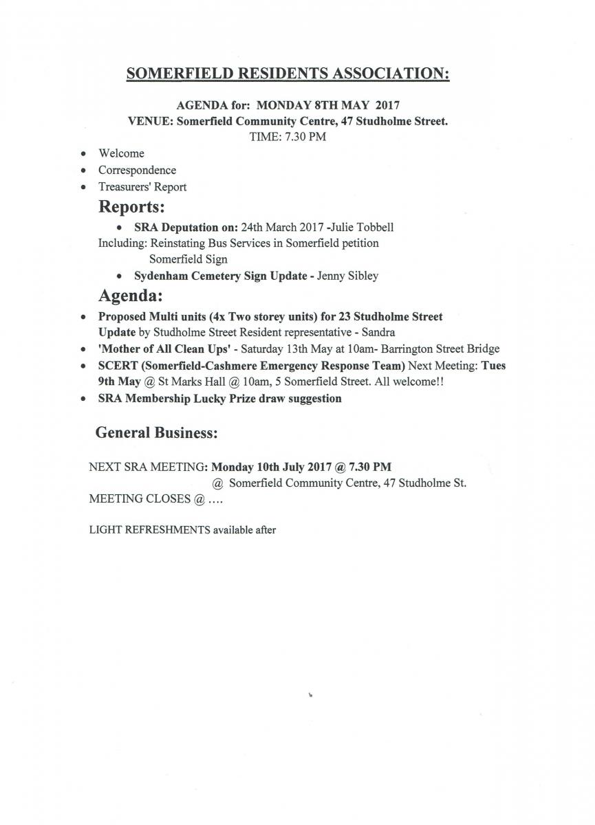 Please let anyone else know about our SRA Meeting if not on Neighbourly … View moreAnyone is most welcome to join us at the Somerfield Community Centre, 47 Studholme Street at 7.30pm.