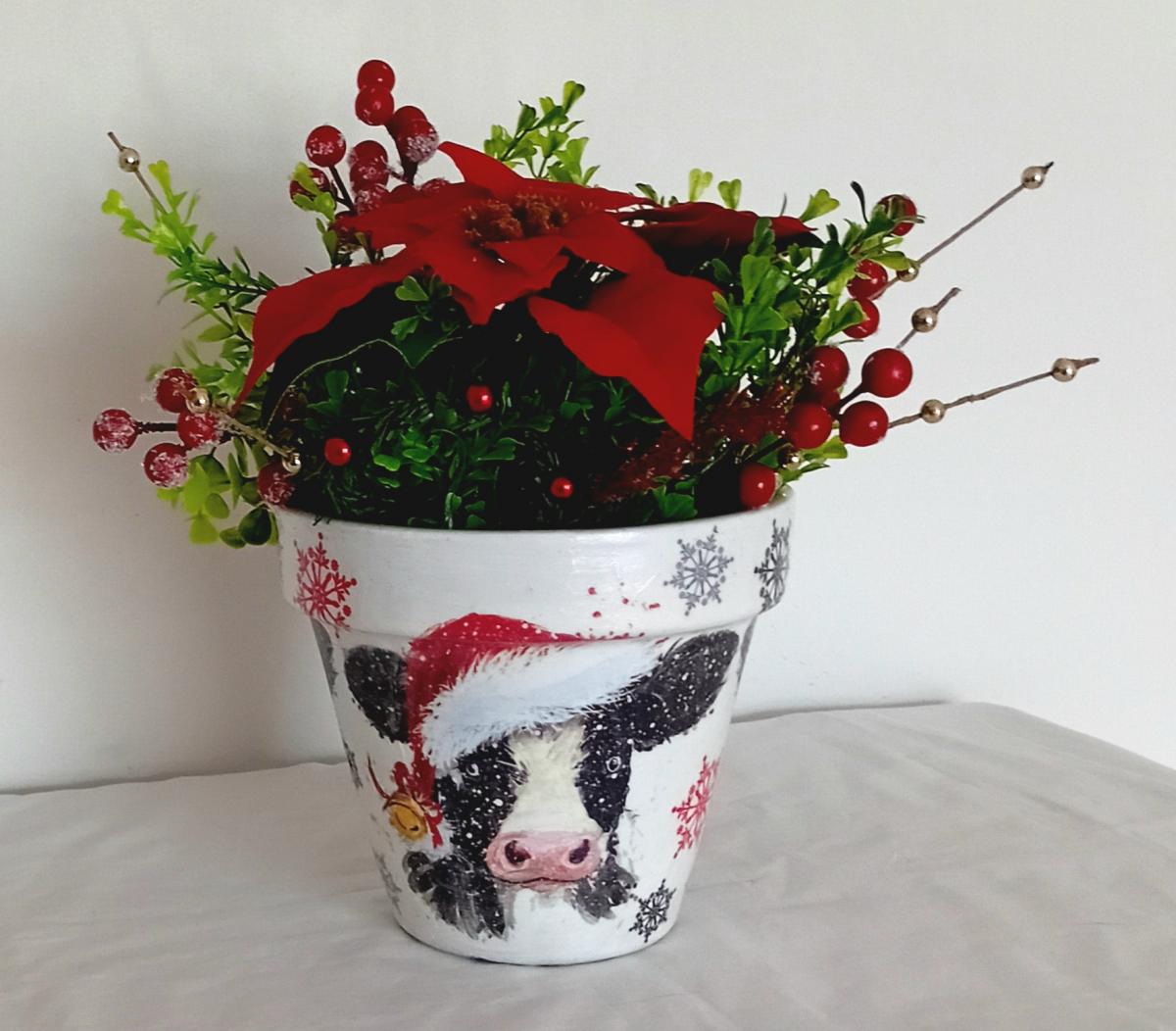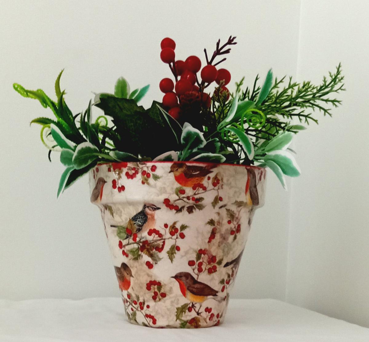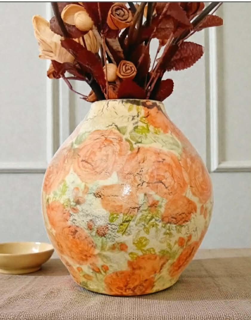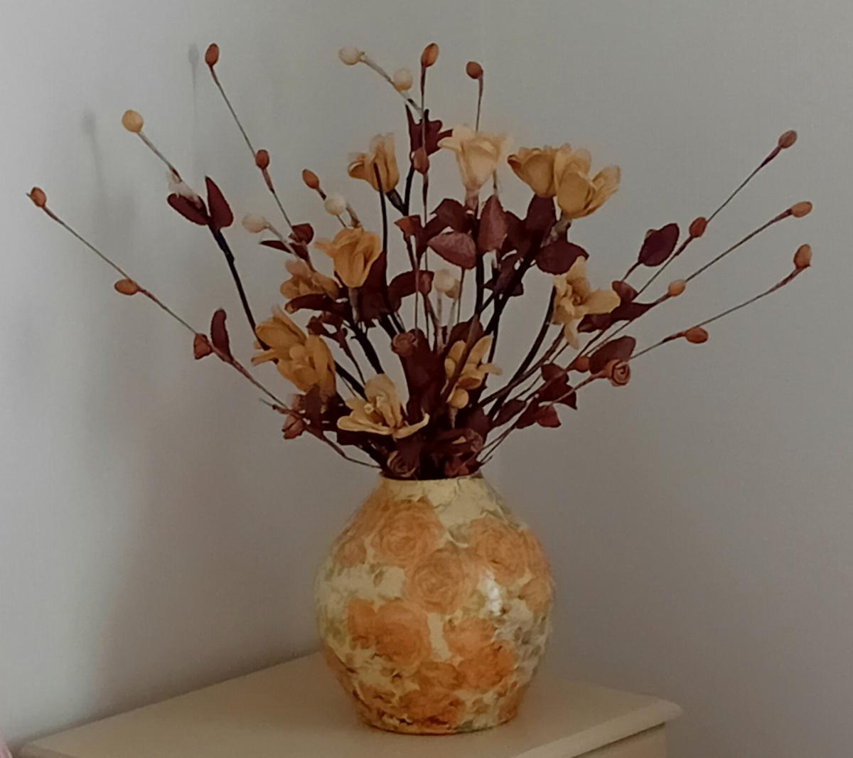 The vase is decoupaged with Neutral tones to fit in any home. The artificial flowers have been carefully selected to match the vase