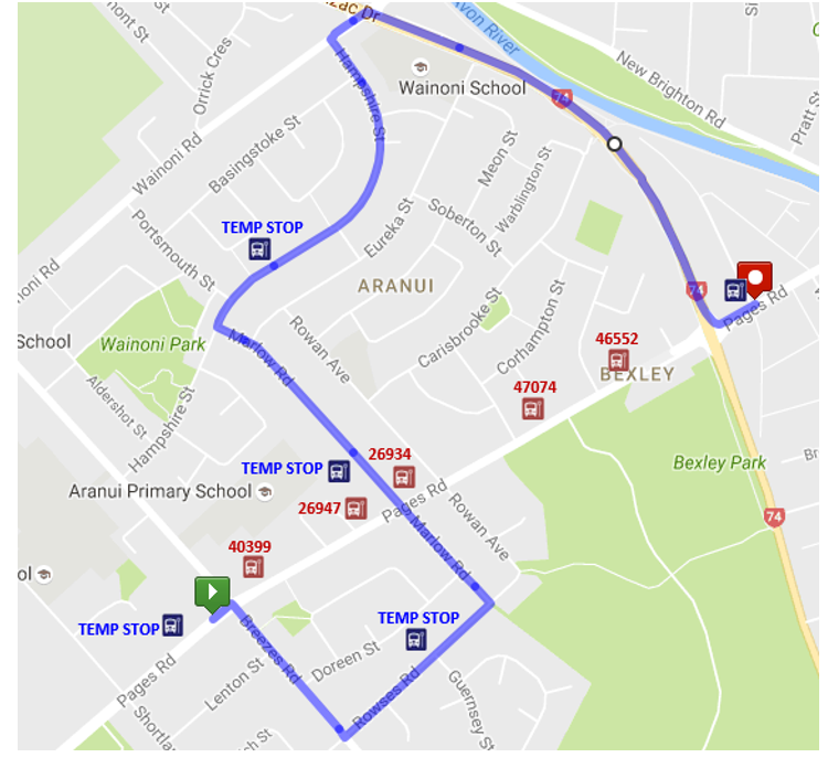 Between Wednesday 19th October and Friday 21st October the Pages Rd detour will change slightly while road works are carried out on Marlow St as well. Buses will detour off Pages Rd onto Breezes Rd, Rowses Rd, Rowan Ave, Eureka St, Marlow Rd, Hampshire St, Wainoni Rd and Anzac Dr back onto Pages… View moreBetween Wednesday 19th October and Friday 21st October the Pages Rd detour will change slightly while road works are carried out on Marlow St as well. Buses will detour off Pages Rd onto Breezes Rd, Rowses Rd, Rowan Ave, Eureka St, Marlow Rd, Hampshire St, Wainoni Rd and Anzac Dr back onto Pages Rd to continue the normal route. All bus stops on Pages Rd between Breezes Rd and Anzac Dr will be closed during this time. Temporary stops are available on Rowses Rd, Rowan Ave and Hampshire St instead. Buses travelling towards the city are not affected. View detour map attached.