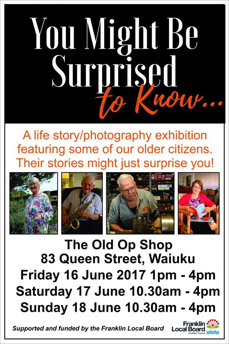 'You Might Be Surprised to Know' is a life story/photography project involving 20 of Franklin's older citizens (Franklin Local Board area). A free exhibition of their surprising short stories and photos will be held in the Old Op Shop, 83 Queen Street, Waiuku 16-18 June. See … View more'You Might Be Surprised to Know' is a life story/photography project involving 20 of Franklin's older citizens (Franklin Local Board area). A free exhibition of their surprising short stories and photos will be held in the Old Op Shop, 83 Queen Street, Waiuku 16-18 June. See www.facebook.com... for more details or the poster in the image attached. This project is supported and funded by the Franklin Local Board.