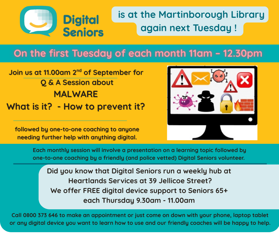 Join us at 11am next Tuesday the 2nd September at Martinborough Library for a Q&A session about Malware brought to you by Digital Senior's Rhonda McCormick and the Wairarapa Library Service - Coaches will be available afterwards for one-to-one help with anything digital and remember we are… View moreJoin us at 11am next Tuesday the 2nd September at Martinborough Library for a Q&A session about Malware brought to you by Digital Senior's Rhonda McCormick and the Wairarapa Library Service - Coaches will be available afterwards for one-to-one help with anything digital and remember we are also available each week on Thursday morning 9.30am - 11.00am at Heartland Services 39 Jellicoe Street - Call 0800 373 646 to make an appointment or just come on down with your phone, laptop or tablet.
