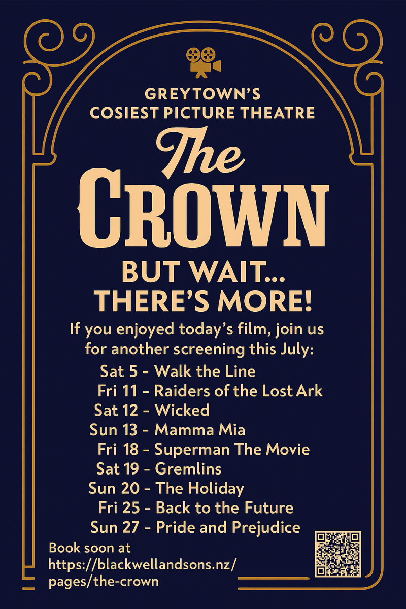 MOVIE TIME: Greytown's Pop Up picture theatre The Crown is now open! 79 Main St look for the signs. Complete with scrumptious mulled wine, beer, popcorn and cookies from Bicycle Kitchen. (tickets $16) All films at 4pm - See these classic films and be cosy & comfy. BOOK HERE … View moreMOVIE TIME: Greytown's Pop Up picture theatre The Crown is now open! 79 Main St look for the signs. Complete with scrumptious mulled wine, beer, popcorn and cookies from Bicycle Kitchen. (tickets $16) All films at 4pm - See these classic films and be cosy & comfy. BOOK HERE blackwellandsons.nz...