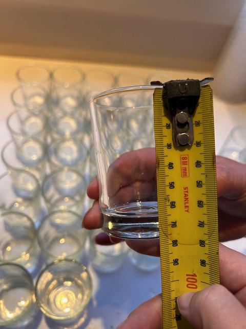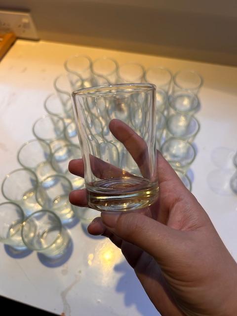 32 x medium sized glass tea-light holders (7.5cm H x 5.5 cm Dia) + 4 small tea-light holders (6 cm H x 5 cm Dia)