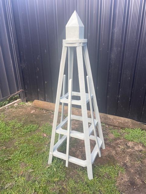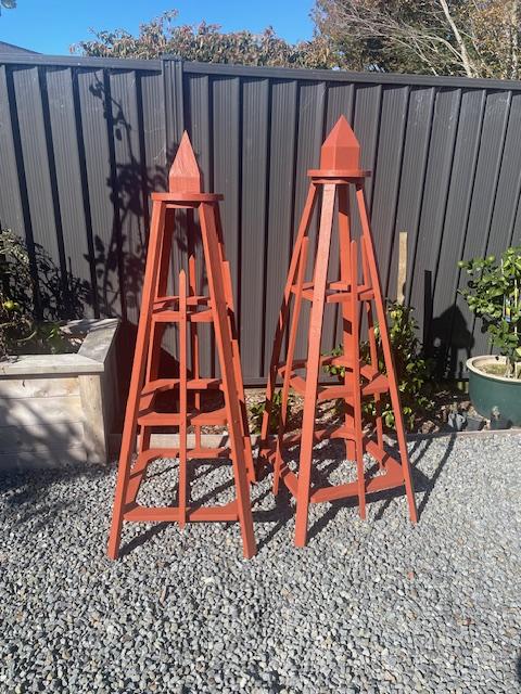 Unique steel coloured obelisks in treated timber . 1.57m & 1.50m high with 500mm square base . $350 for the two or $180 each . Pick up Greytown . Phone 0275285269