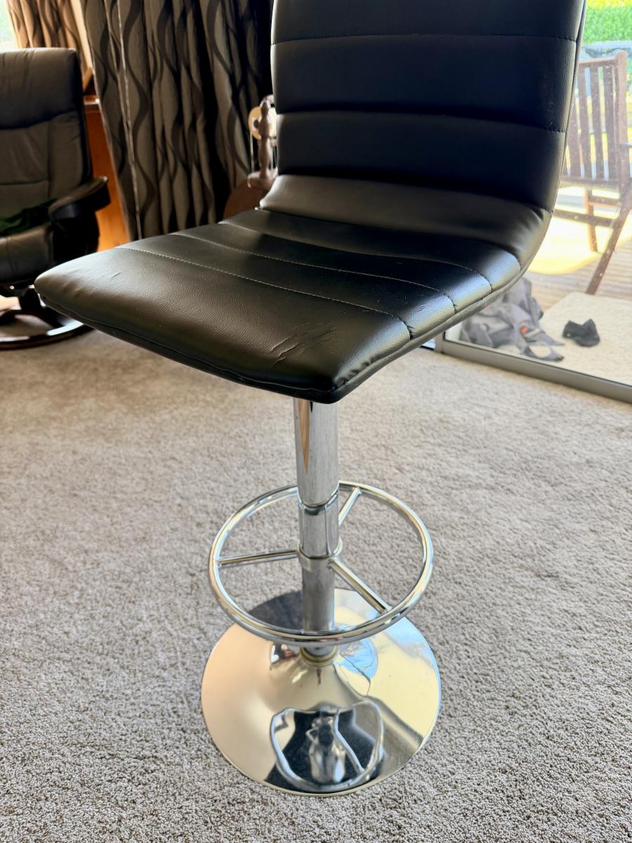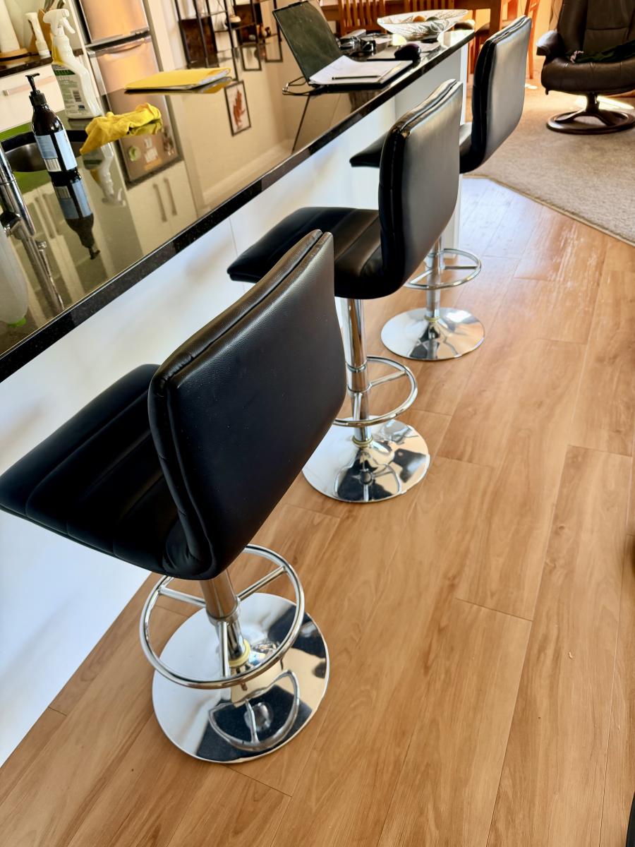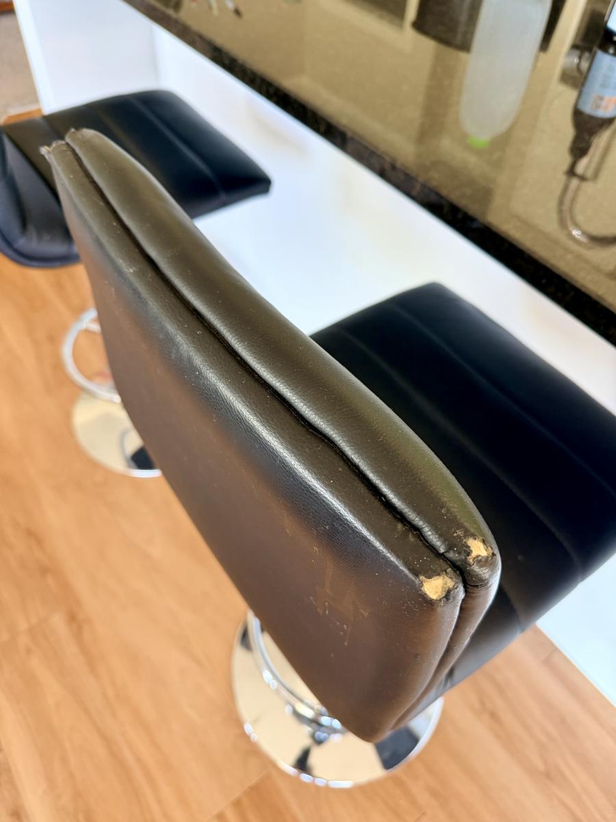 Stools in good condition. Variable height. Hydraulic lifters still work well. Small cosmetic damage on back of one chair as shown in image but rest in great condition. Replacement cost $450