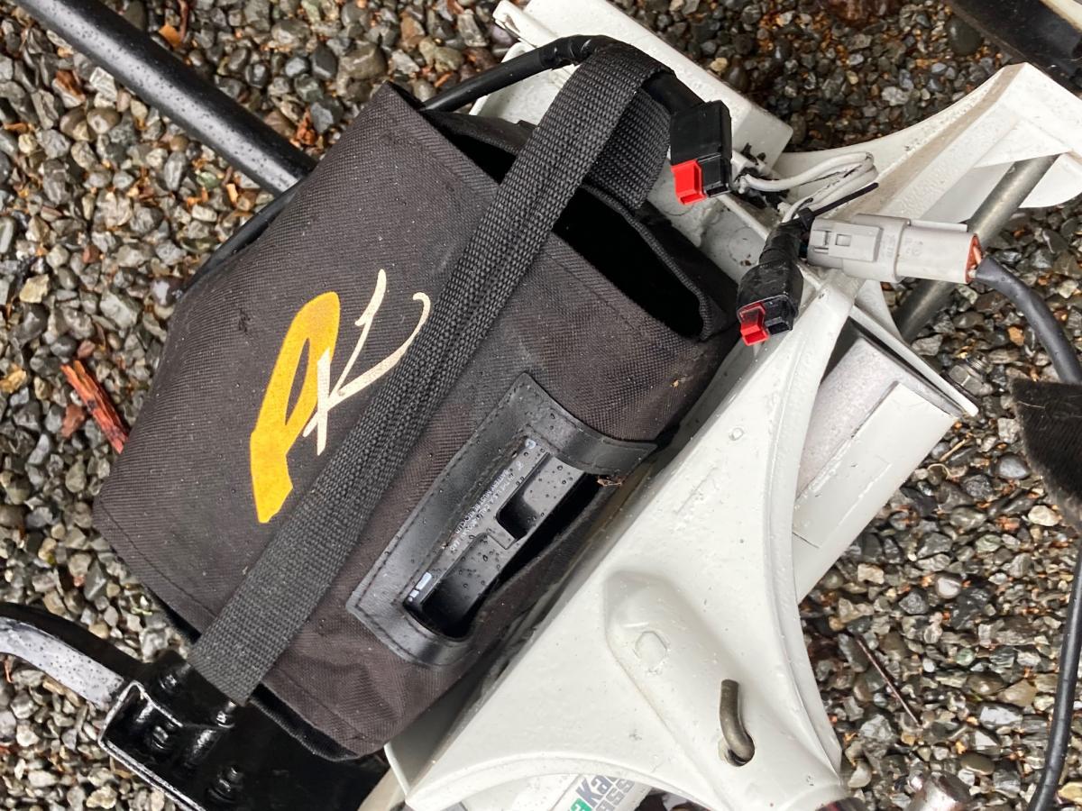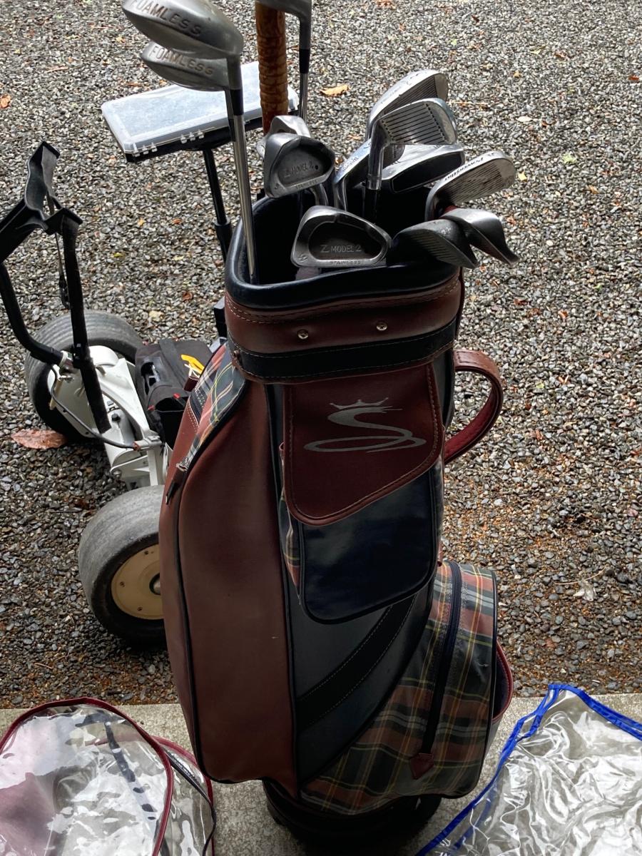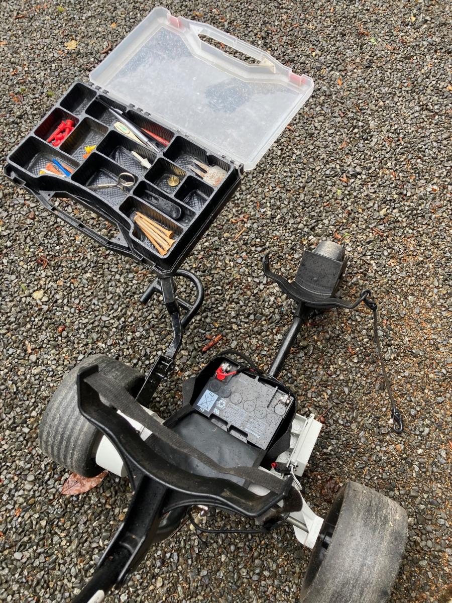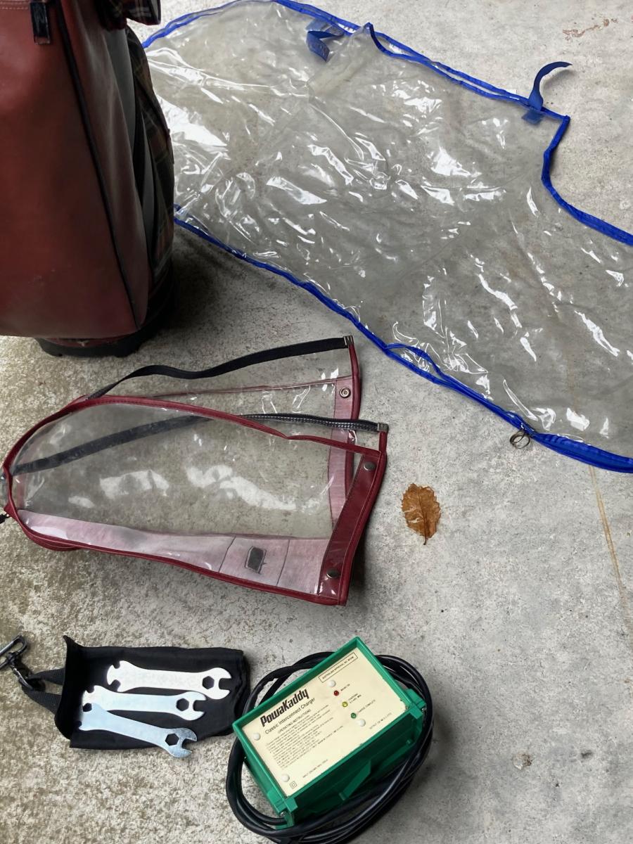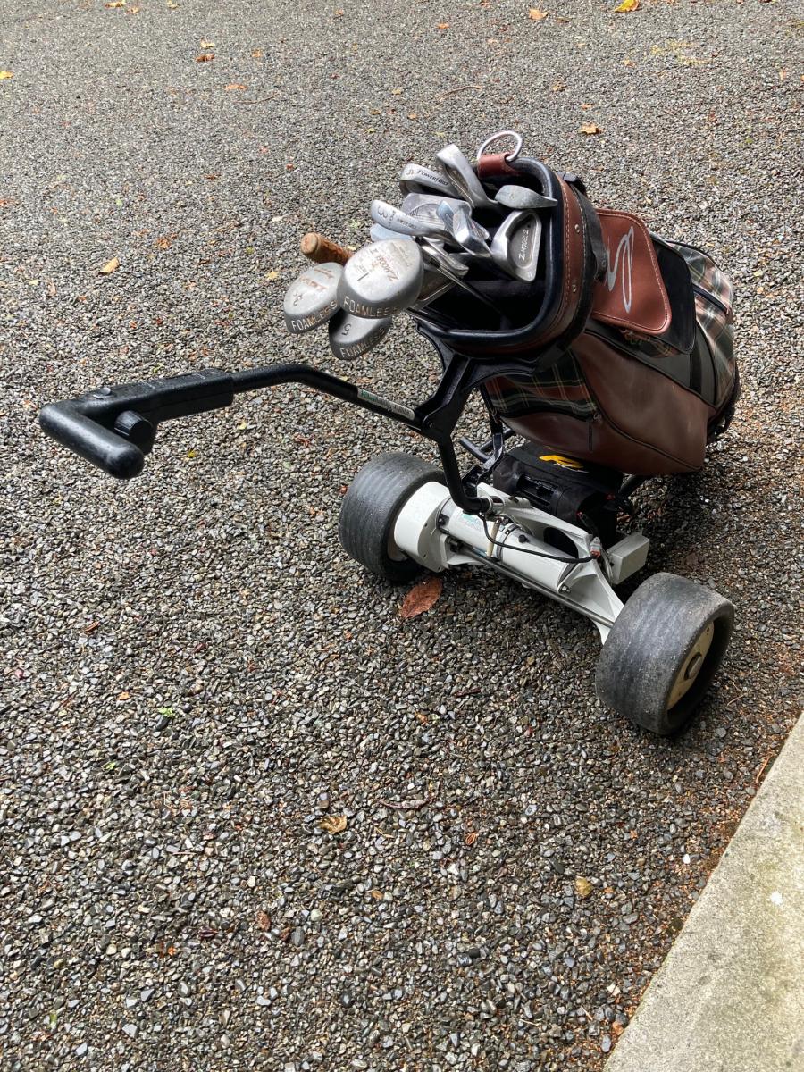 Older model but still runs well. Selling on behalf of father. He assures me it covers 9-18 holes on a charge as the battery was bought new and has been little used. Clubs are Z model and PowerBilt. Comes with umbrella and rain covers and assorted bits in the spring-loaded box seat.