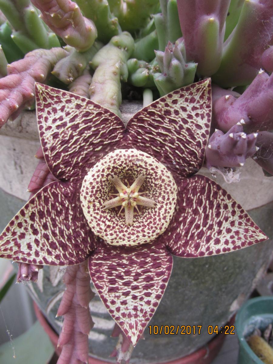 This potted plant has thick fleshy leaves, but no thorns. It produces beautiful large star shaped speckled flowers which hand on a drooping stalk.