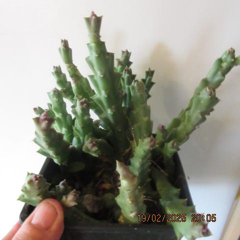 The … View moreThis potted plant has thick fleshy leaves, but no thorns. It produces beautiful large star shaped speckled flowers which hand on a drooping stalk.