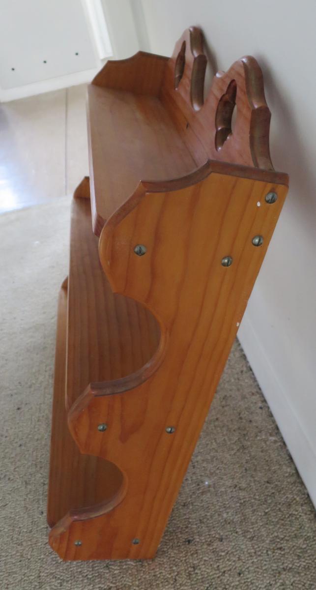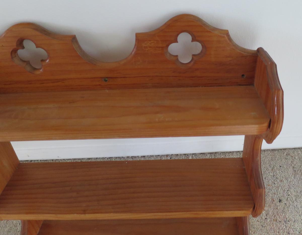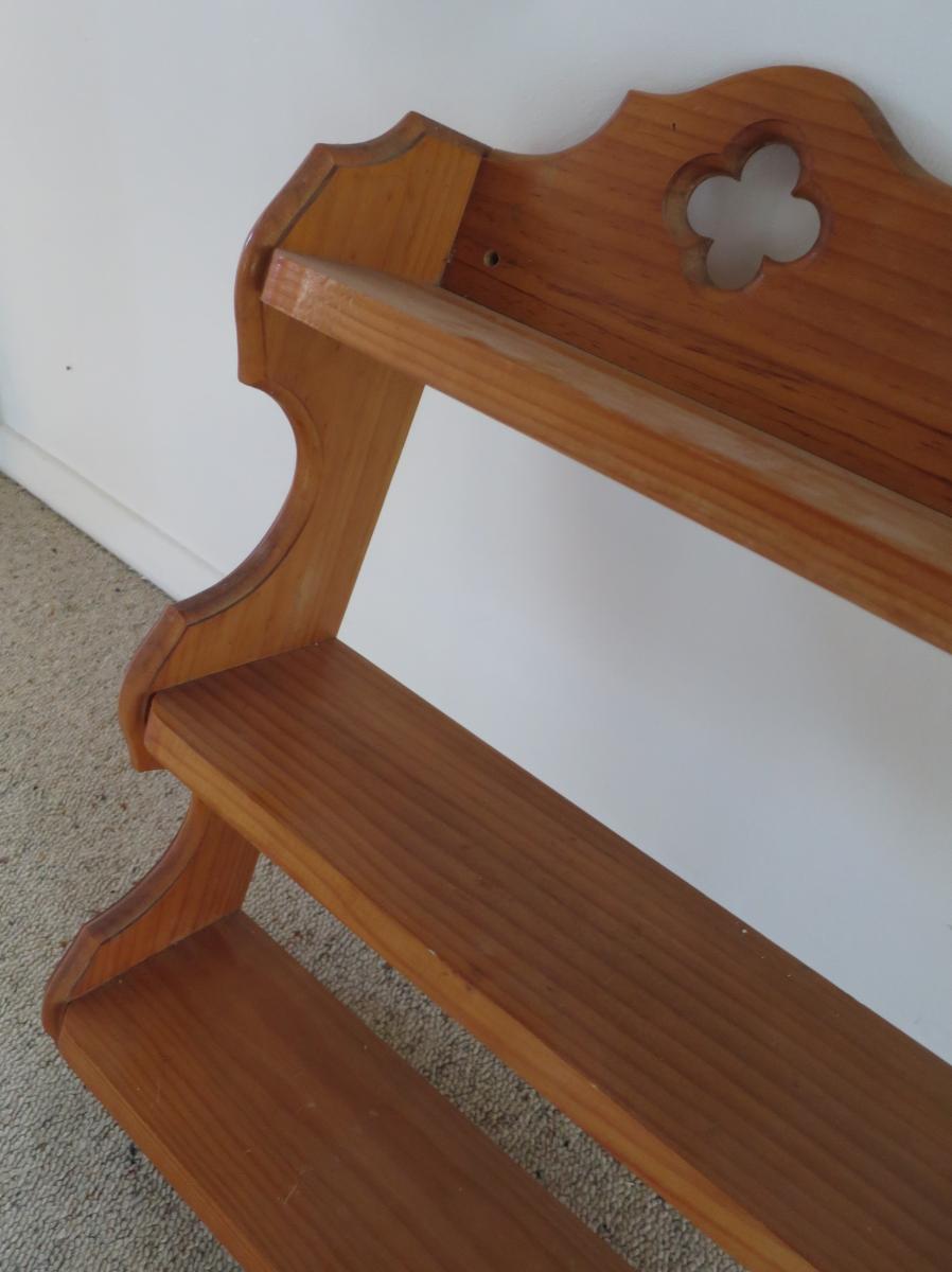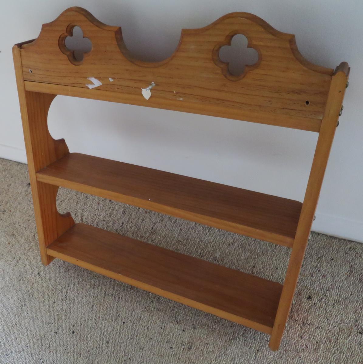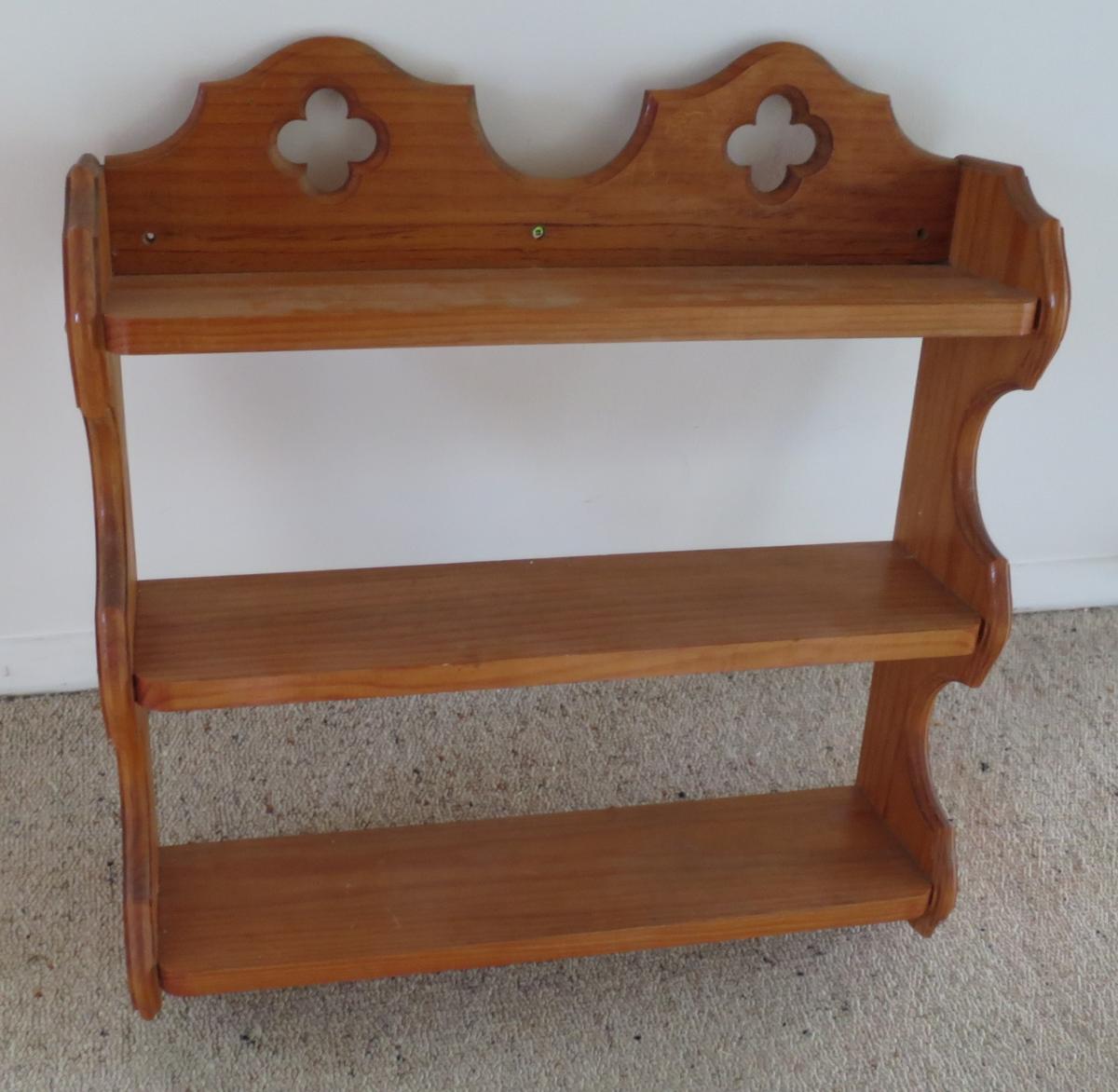 A pale wood, sorry dont know what it is, hanging shelf with three 12cms wide shelves.