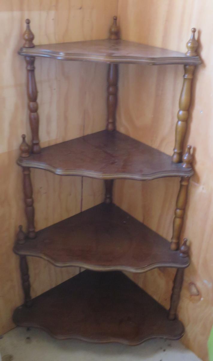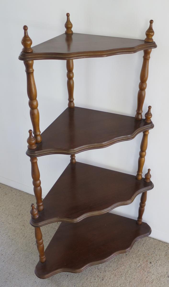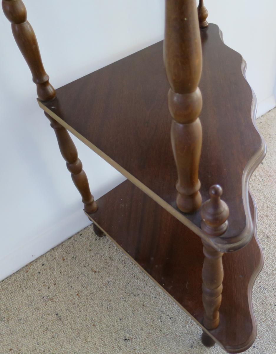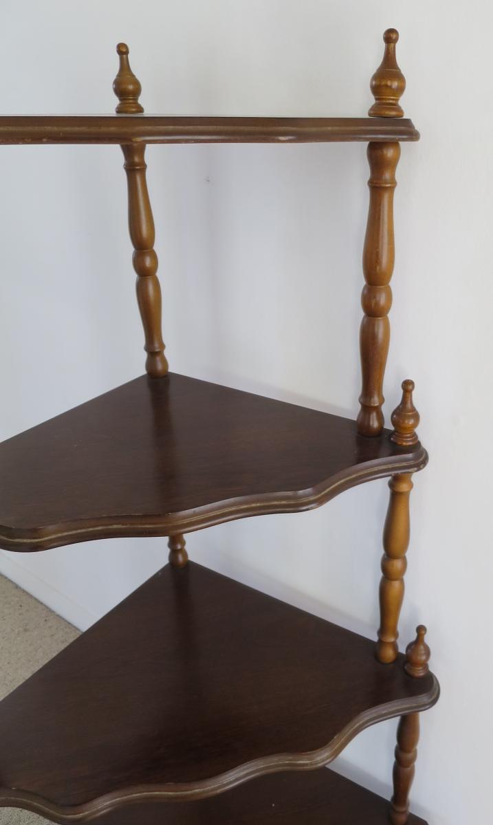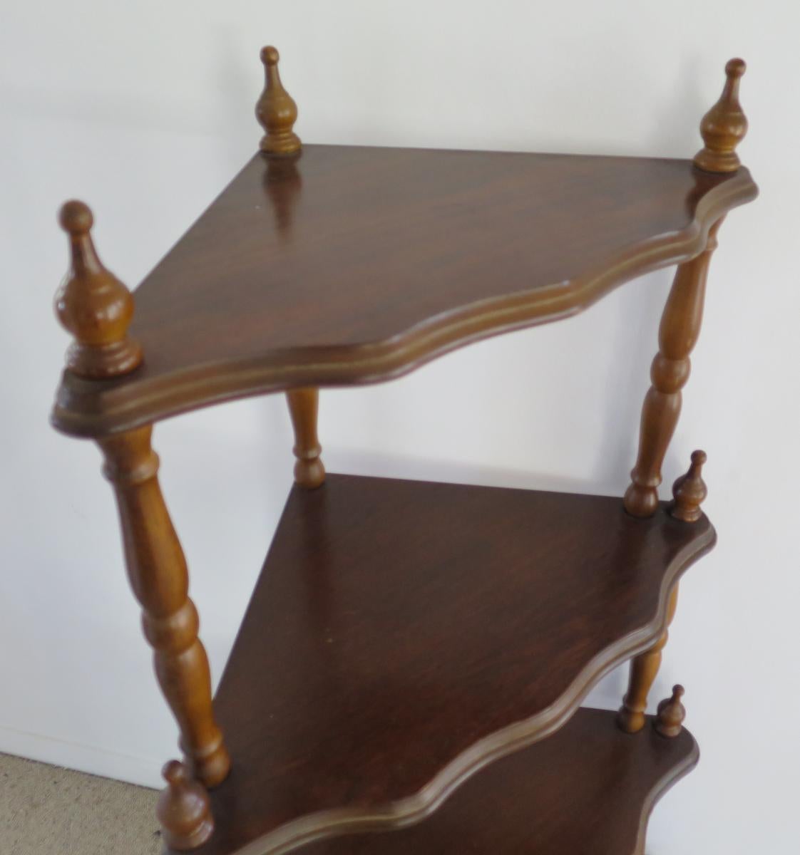 A mahogany corner what not with a curved front to the shelves and turned legs and finials at each level.