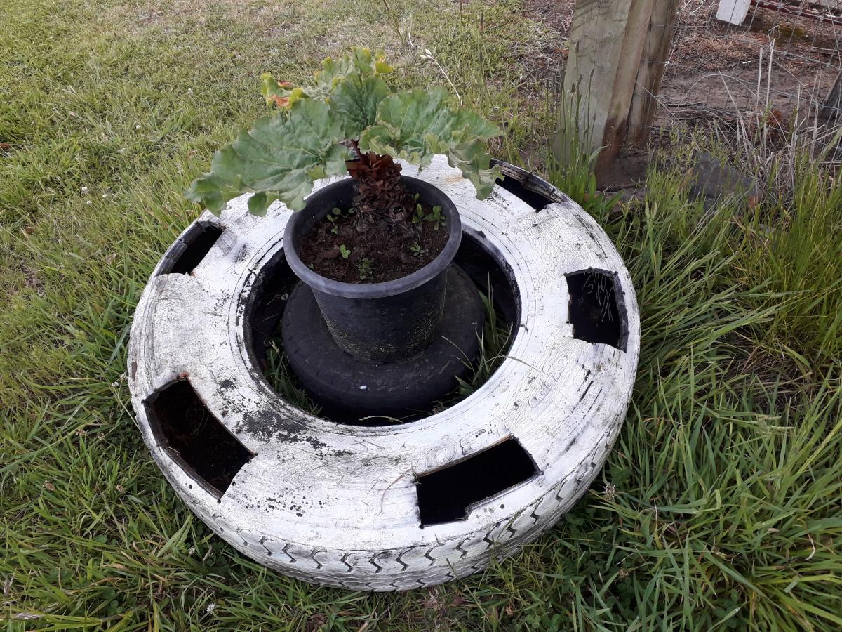 Rhubarb plant is gone. Tires still available. Also have a few 4x4 tires with planter holes if wanted. You can make a little garden anywhere with it.