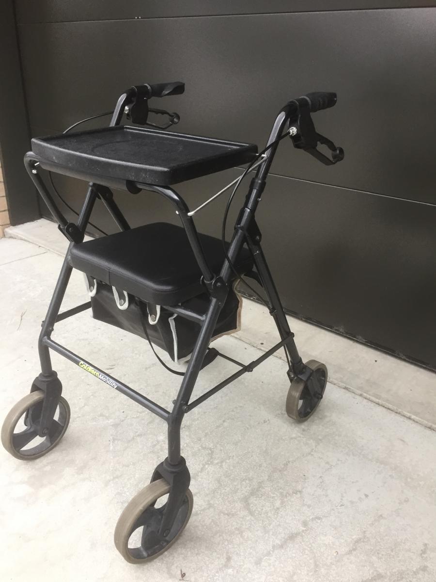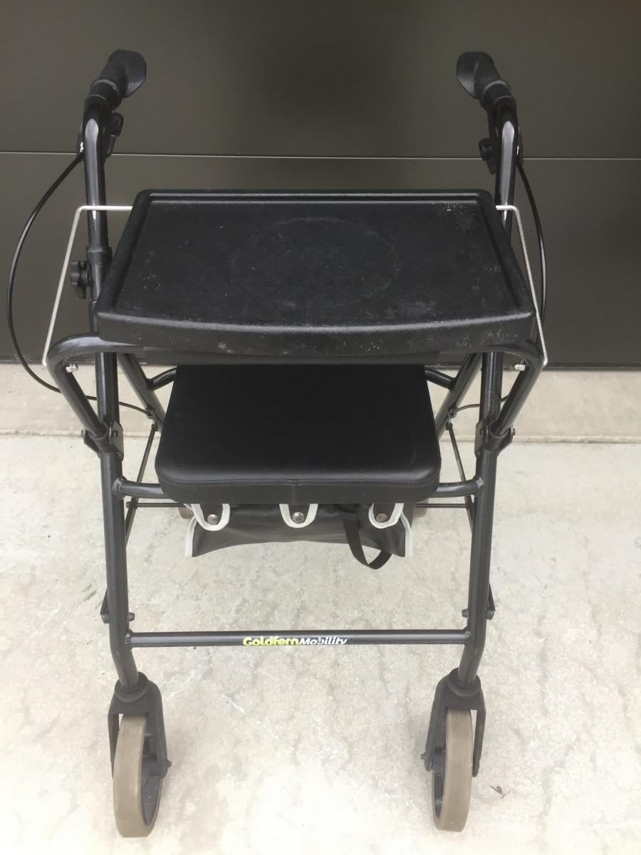 Solid walking frame with seat and tray.