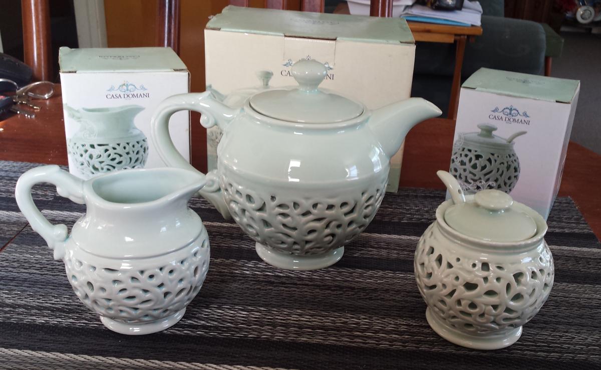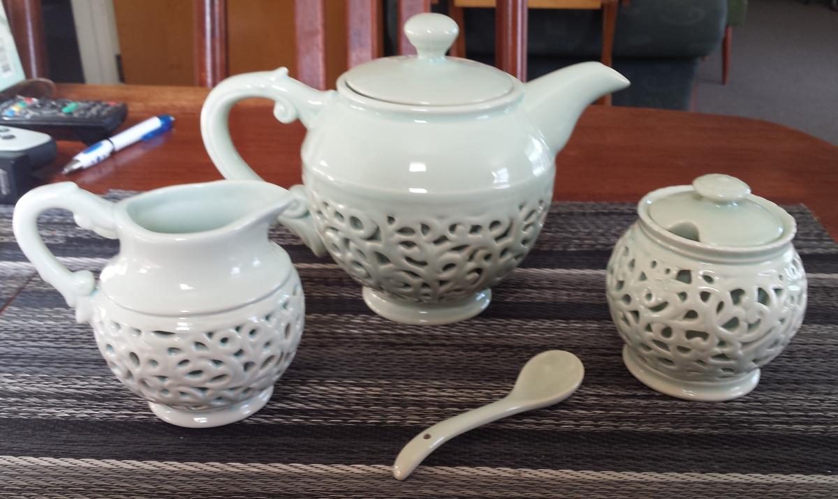 Tea Pot, Sugar Bowl + Spoon, Milk Jug