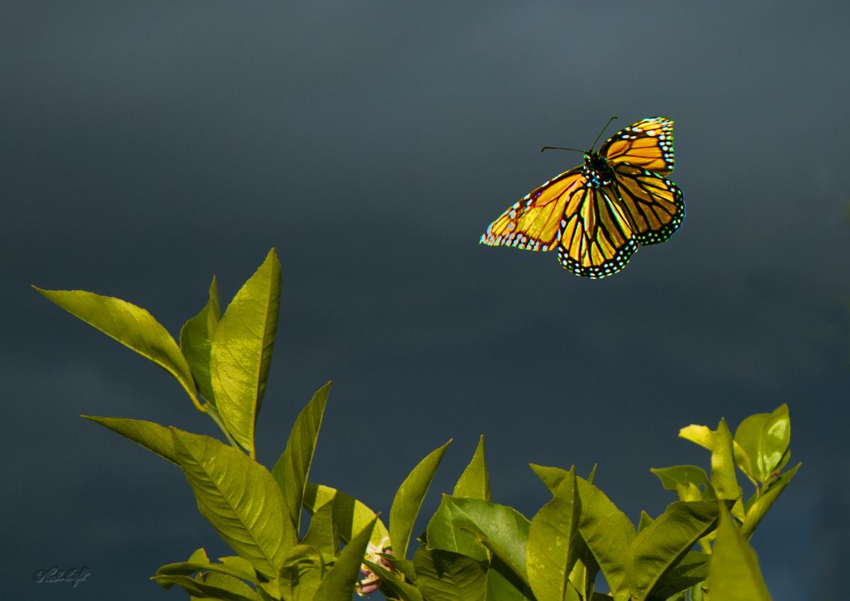 Monarch over my lemon tree. It seems that something about lemon trees attracts monarch butterflies.