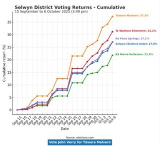 With 209 more votes recorded today, the Malvern Ward continues to set the pace across Selwyn — now sitting at 37.3% votes record as at 3:49 p, 6 October 2025, well ahead of the district average (27%).
