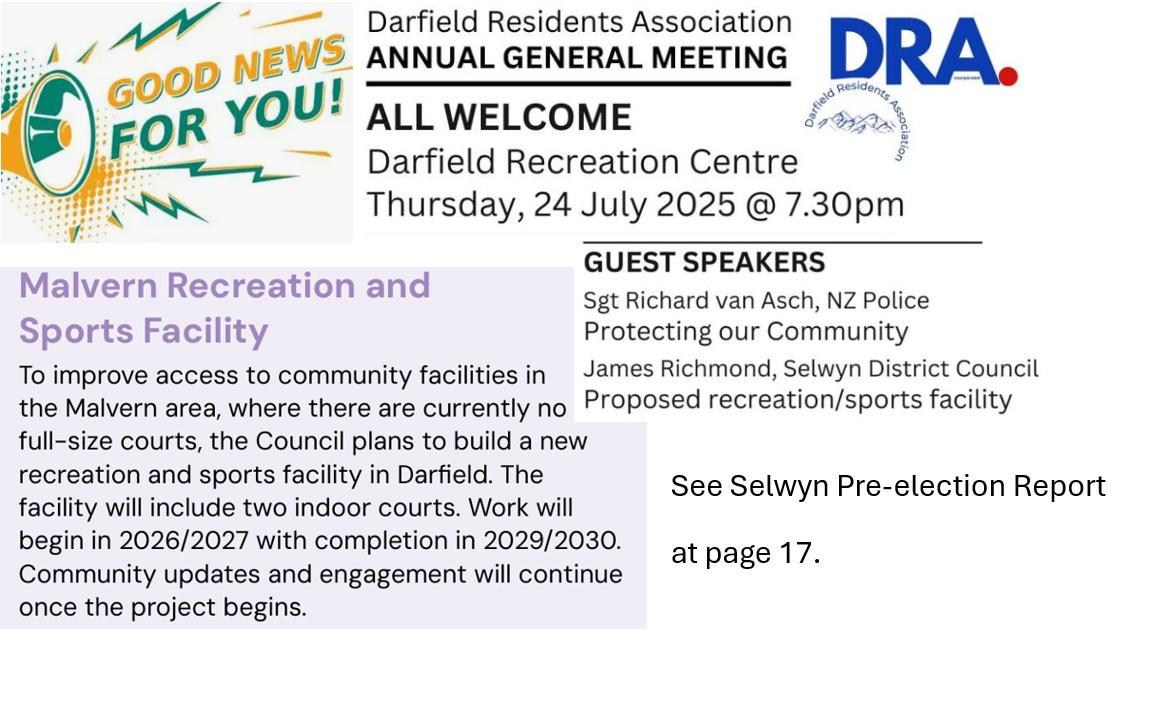 To improve access to community facilities in the Malvern area, ...[SDC] plans to build a new recreation and sports facility in Darfield. The facility will include two indoor courts. Work will begin in 2026/2027 with completion in 2029/2030.
