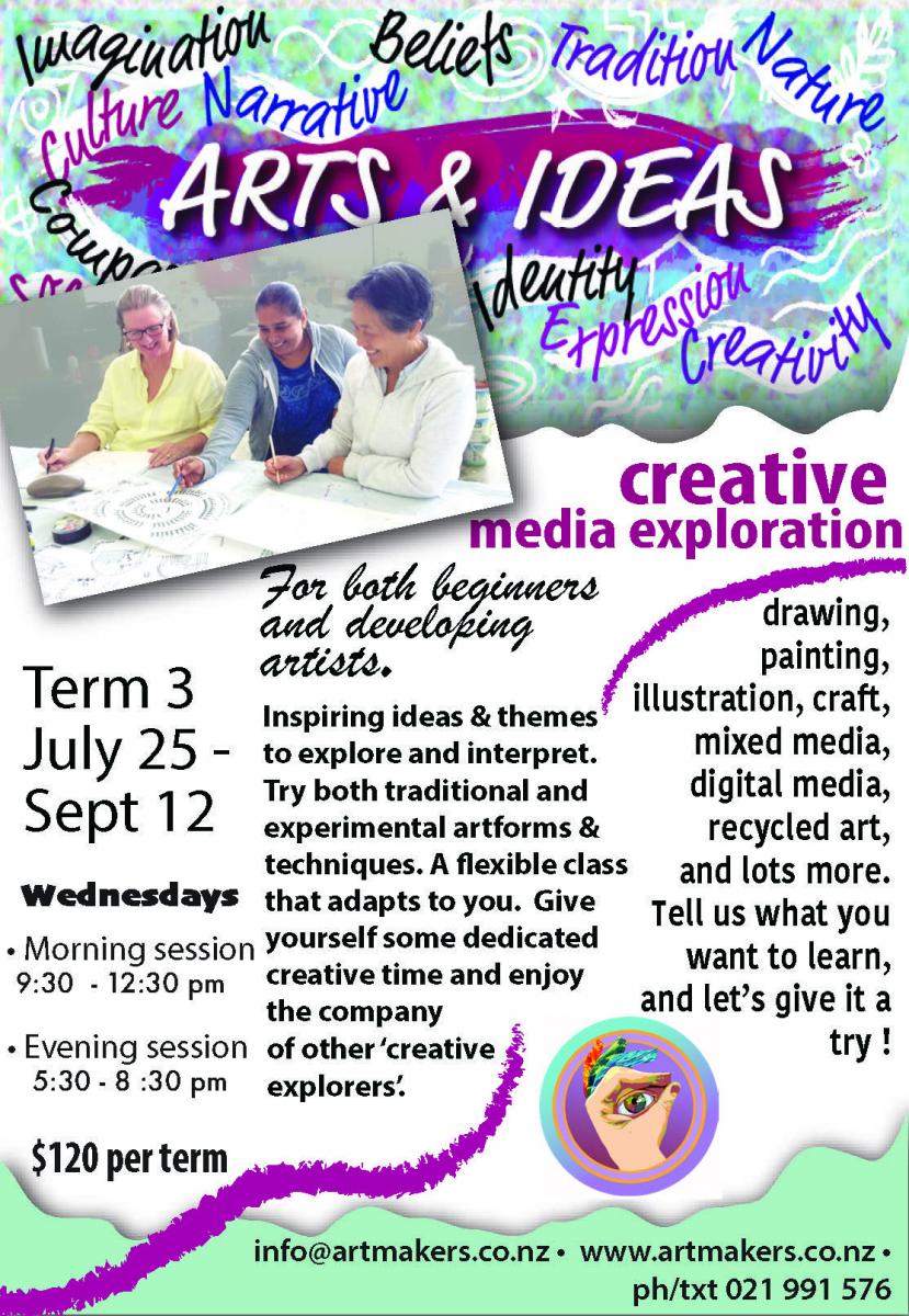 Arts & Ideas is a unique and flexible art exploration programme, aimed at bringing out confidence and creative thinking in both adult beginners and continuers. Each term we explore a variety of media, techniques and themes, traditional and contemporary arts, culture & ideas intermingle, and… View moreArts & Ideas is a unique and flexible art exploration programme, aimed at bringing out confidence and creative thinking in both adult beginners and continuers. Each term we explore a variety of media, techniques and themes, traditional and contemporary arts, culture & ideas intermingle, and we also explore personal stories. Some participants have done no art since they were children, and rediscover the joy of artmaking. Practicing artists are challenged to work in a collaborative, community way. Art is a universal language that makes it possible to bridge these differences and find commonality. Artmakers has 33 years of experience working with learners at all ages and stages, so everyone can find something that grows their creativity. The conversations are just as interesting ! Held on Wednesdays, x8 sessions per term. All classes on Wednesdays: Term 3 July 25 - Sept 12. Mornings 9:30 am - 12:30 pm pr Evenings 5:30 - 8:30 pm $120 per term for either morning or evening session.