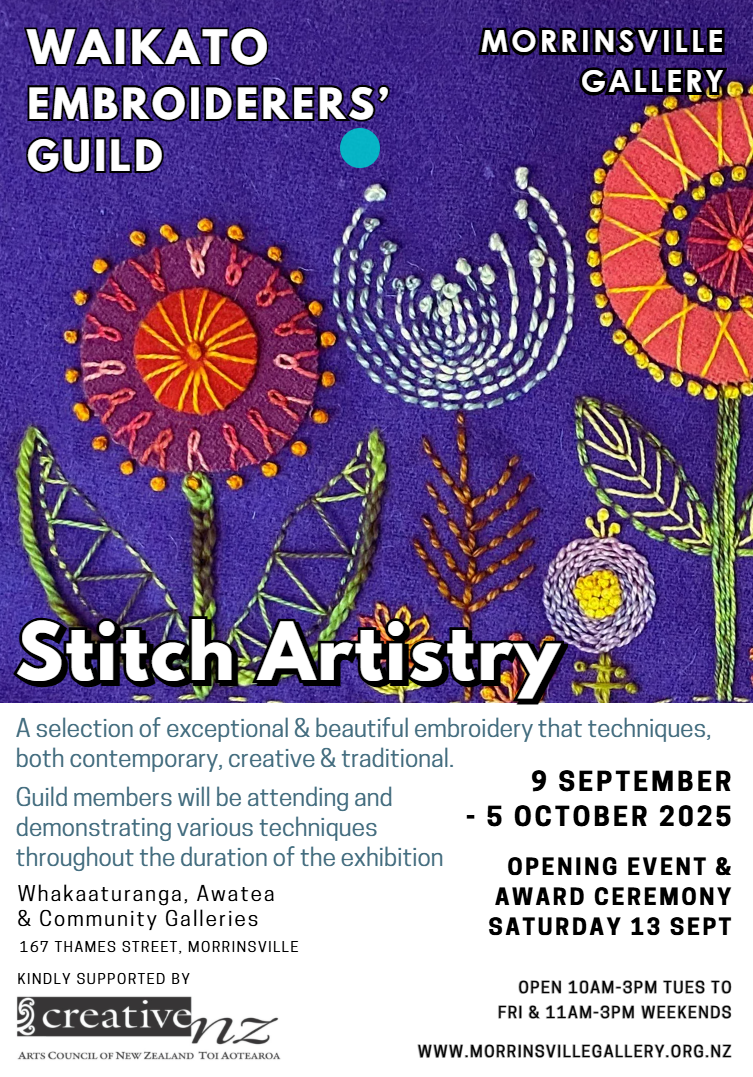 Waikato Embroiderers' Guild is holding their biennial exhibition at the Morrinsville Gallery see poster for details. You'll see some stunning embroidery, you won't be disappointed.