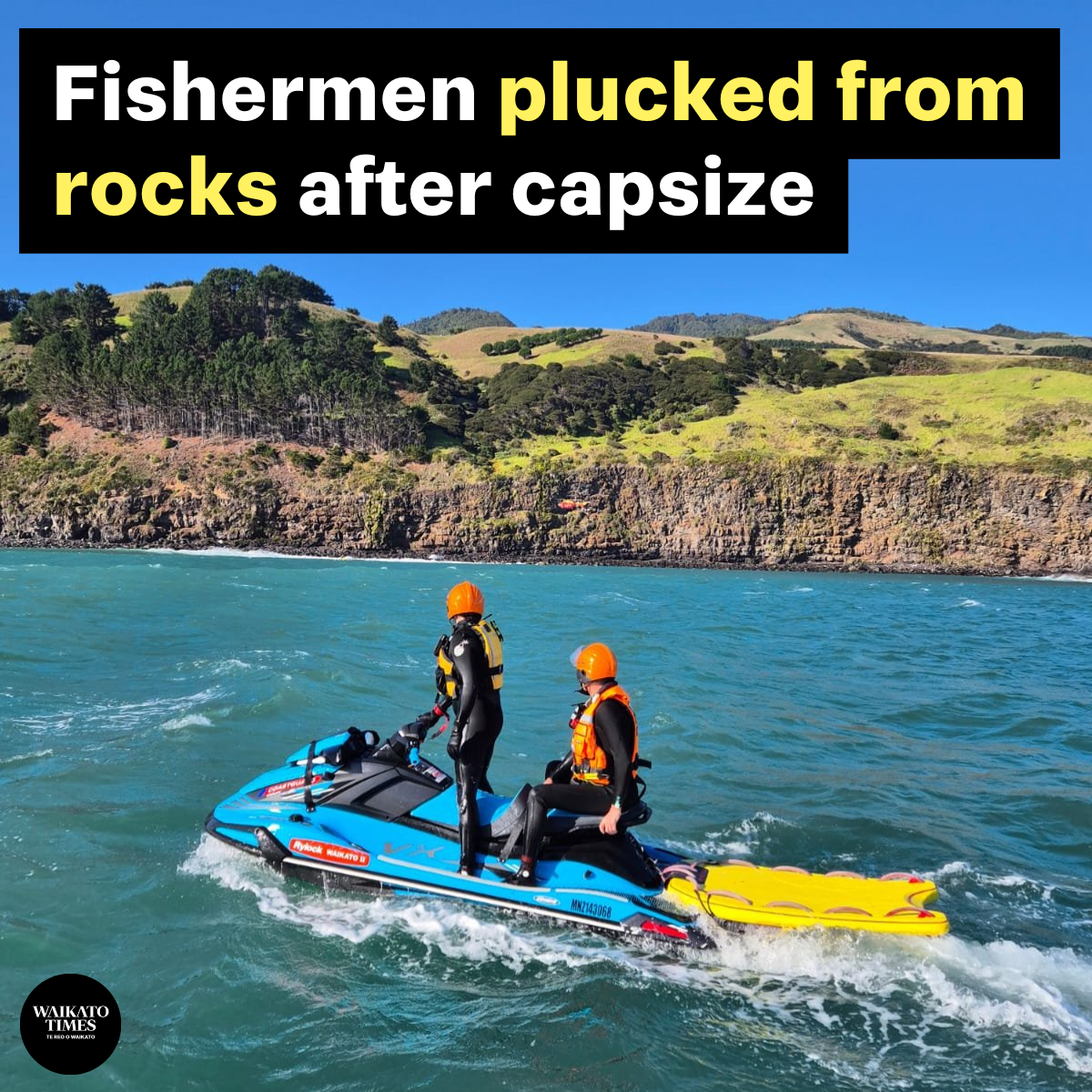 Three fishermen who were rescued from rocks after their boat capsized south of Raglan on Sunday credited their lifejackets with saving them.