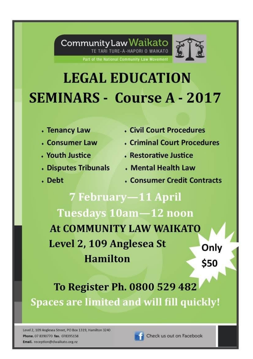 At the Community Law Waikato level 2, 109 Anglesea Street Hamilton. to register Ph 0800 529 482, $50, Spaces are limited and will fill quickly.