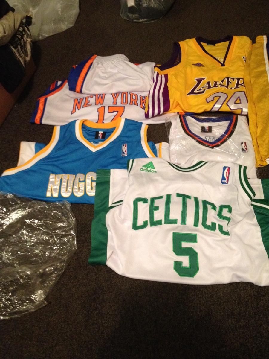Selling these NBA singlets , new xL , lakers with shorts and New York with shorts . Celtics , nuggets, New York tops only. Selling $150.00 for lot , great Xmas present .