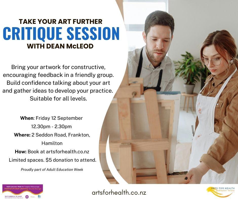 Are you an artist wanting fresh feedback and new ideas? Our art critique event is a supportive space where creatives bring their work, share openly, and receive constructive insights. Guided by facilitators, each session focuses on colour, composition, technique, and meaning – helping you refine … View moreAre you an artist wanting fresh feedback and new ideas? Our art critique event is a supportive space where creatives bring their work, share openly, and receive constructive insights. Guided by facilitators, each session focuses on colour, composition, technique, and meaning – helping you refine your practice and gain confidence.