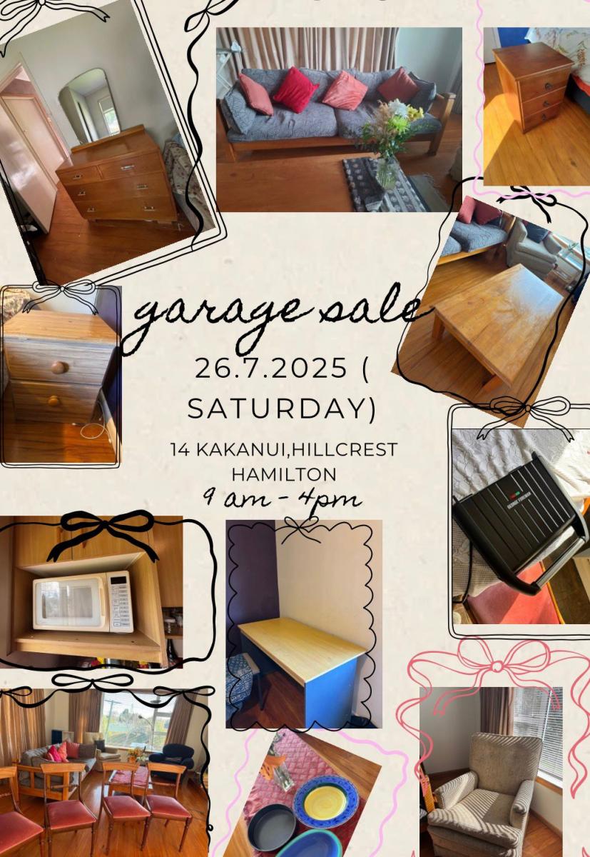 Microwave oven, sandwich maker, comfy couch and sofa, desks, bed, futon, silverware and pots and pans. All priced to go.