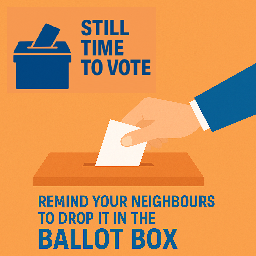 By this point, many of you would have already voted - well done, and thank you; you’ve done your part to make democracy real. But the final few hours still matter - if you know someone who hasn’t voted yet, like a neighbour, friend or family member, do give them a gentle nudge. Or maybe even … View moreBy this point, many of you would have already voted - well done, and thank you; you’ve done your part to make democracy real. But the final few hours still matter - if you know someone who hasn’t voted yet, like a neighbour, friend or family member, do give them a gentle nudge. Or maybe even offer them a lift into town if they need one? When we encourage one another to take part, we strengthen more than the process - we strengthen community. Let’s make sure every voice that wants to be heard, is heard!