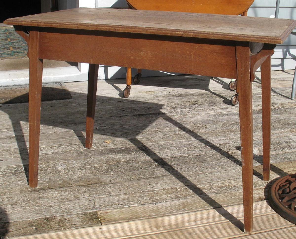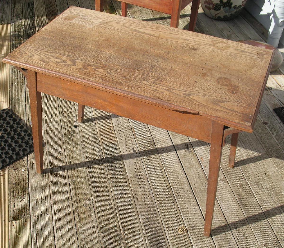 Old oak table that I bought to restore but sadly never got around to it, and now never will. Measure 92cm by 52cm x 65cm. Has a few holes in the top, and one edge is damaged (I was going to saw a tiny bit off and make it into a hall table) Will come up nice