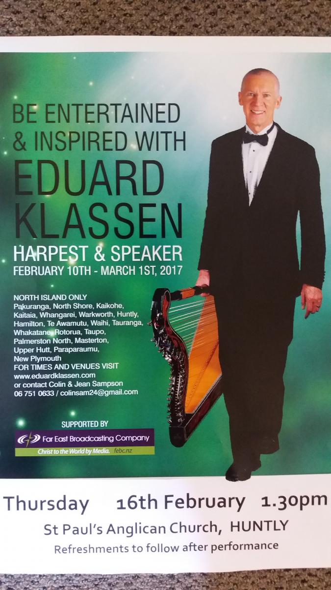 Eduard Klassen harpist & speaker Feb 10th March 1.30pm St Paul's Church William St Huntly, refreshments to follow the performance