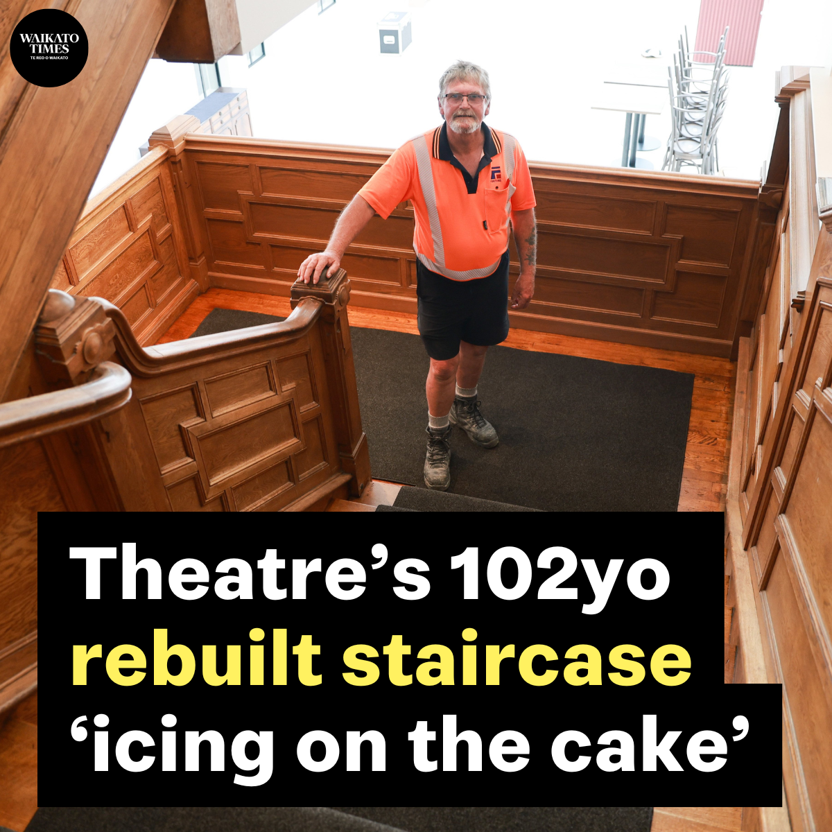 Possibly the most will… View moreA century-old American staircase, likely ascended by Queen Elizabeth II, is the crowning glory for the builders of the Waikato Regional Theatre.