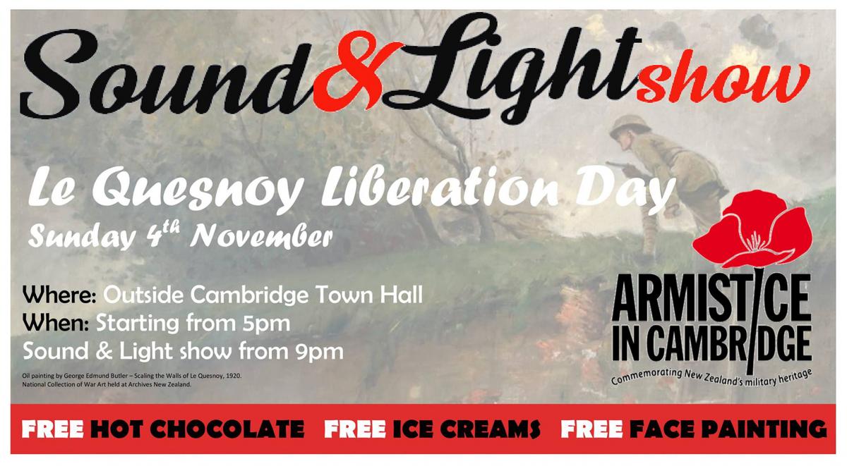 Armistice in Cambridge invites you this Sunday, the 4th, at 5PM to a Free Community Event: Le Quesnoy Liberation Day celebration. At Cambridge Town Hall. WITH the Sound & Light Show from 9PM.